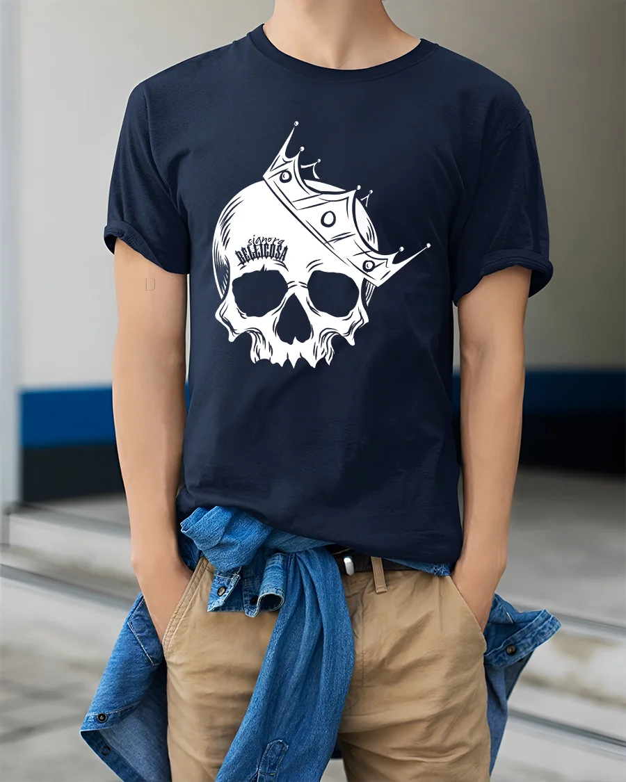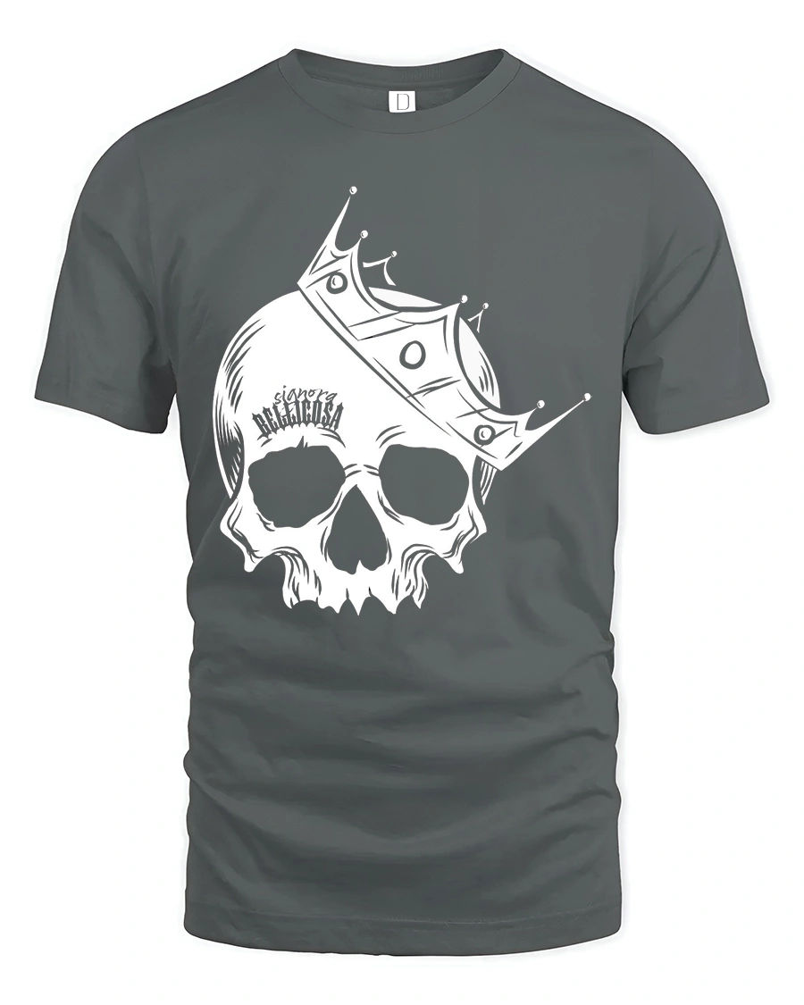 The design features a detailed skull wearing a crown, symbolizing power, rebellion, and fearless individuality.