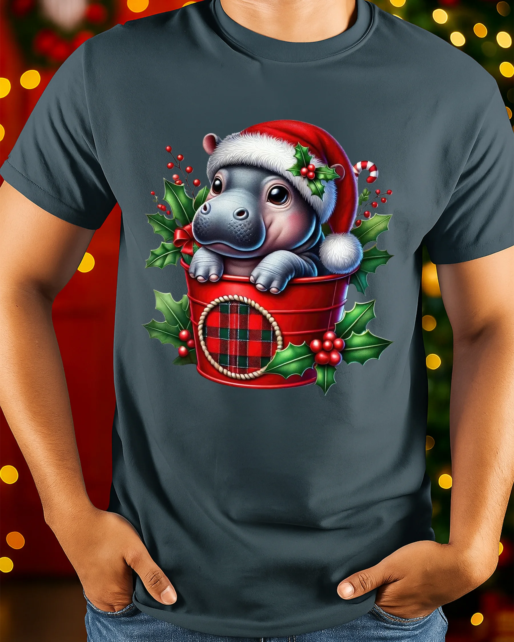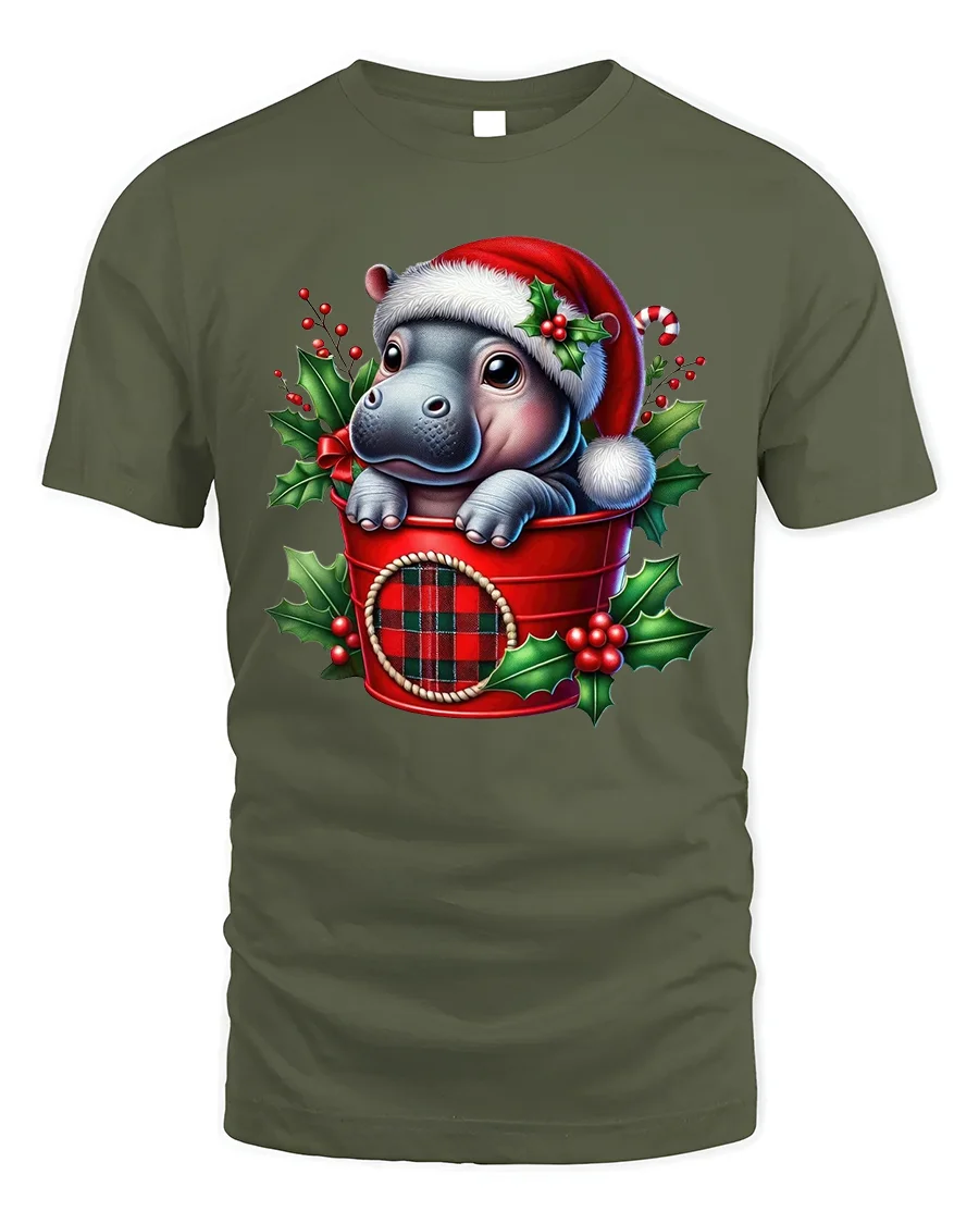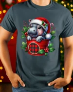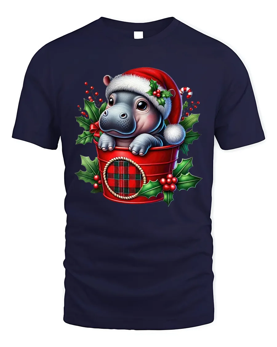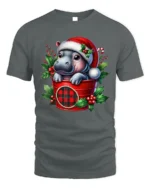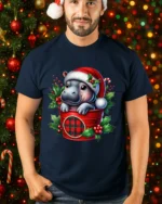 Add a dose of holiday cuteness to your wardrobe with our Cute Baby Hippo in Santa Hat Christmas Holiday T-Shirt. Featuring an adorable baby hippo peeking from a festive red plaid bucket, surrounded by holly leaves and berries, this design captures the cheerful and heartwarming spirit of Christmas. It’s a fun, unique choice for anyone who loves animals and holiday charm.