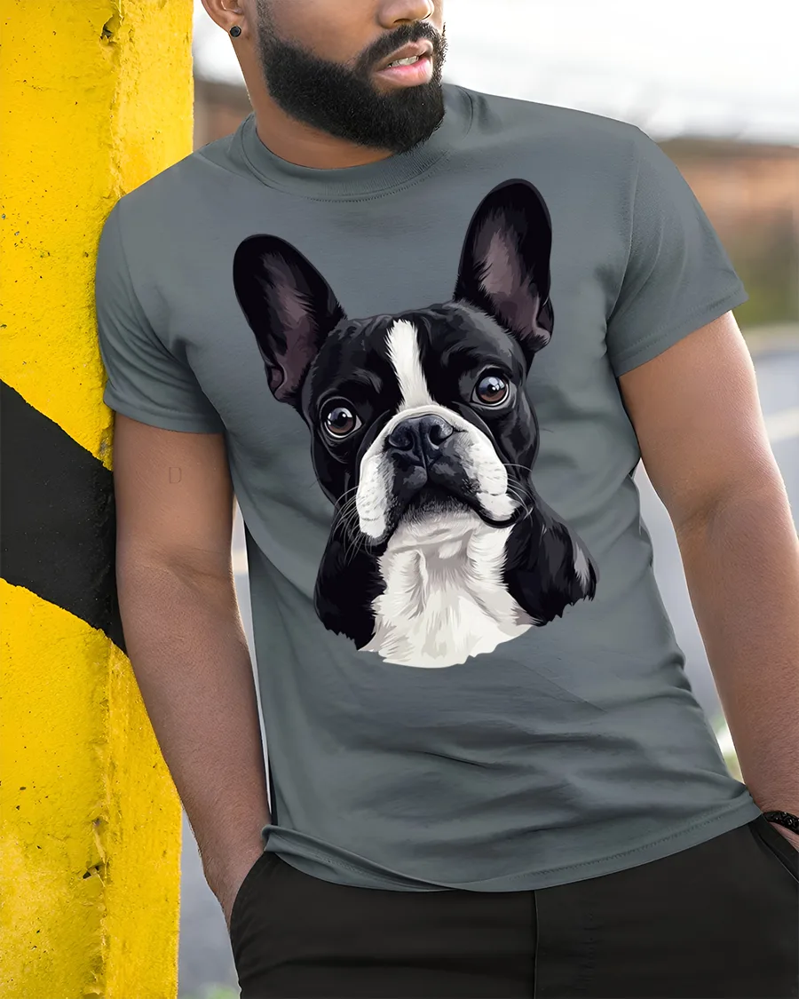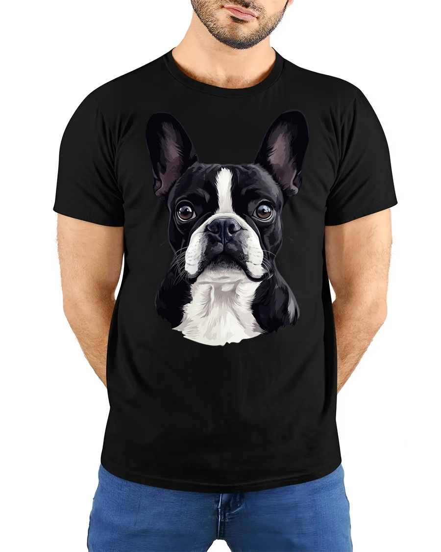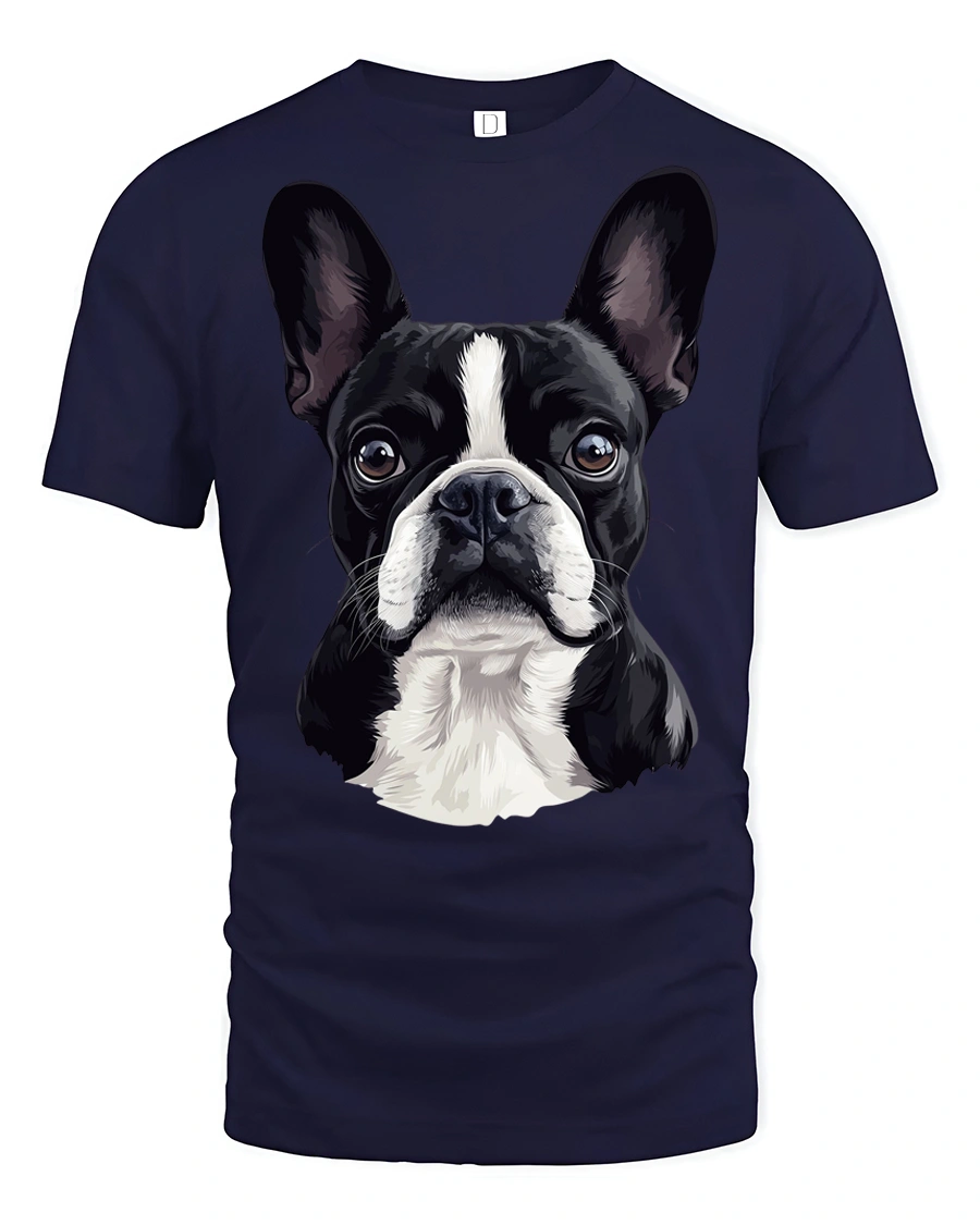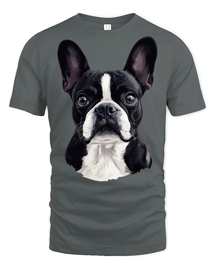 This boston terrier t shirt showcases a lovable dog portrait that reflects the affectionate and lively spirit of Boston Terriers.