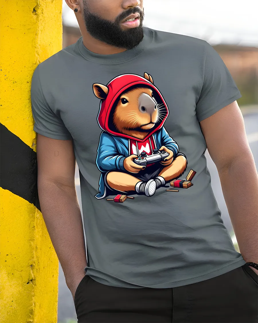 The design features an adorable capybara wearing a hoodie while holding a game controller, creating a fun and relatable gaming moment.