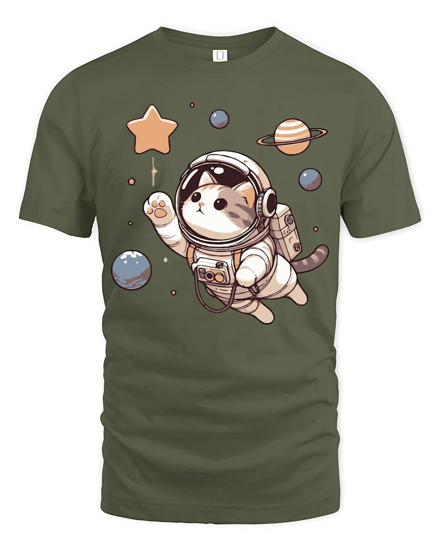 Cute Cat Astronaut Space Graphic T Shirt Cosmic Kitty Tee - military green t-shirt on white background