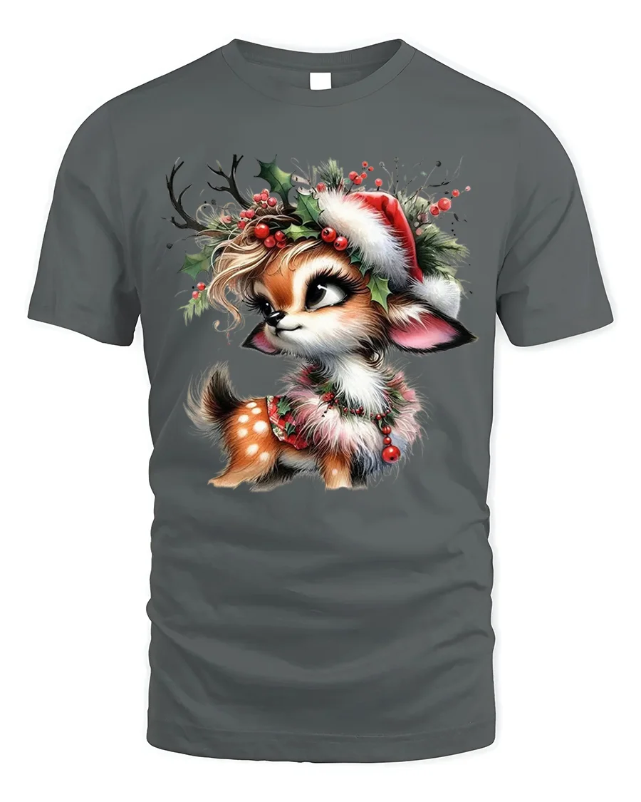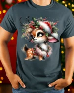 Bring the magic of the holidays to life with this Cute Christmas Deer T-Shirt Holiday Reindeer Graphic Tee. Featuring an adorable fawn dressed in festive holly, berries, and a Santa hat, this design perfectly captures the charm and warmth of the Christmas season. It’s the ideal tee for anyone who loves cozy winter vibes and cute holiday style.