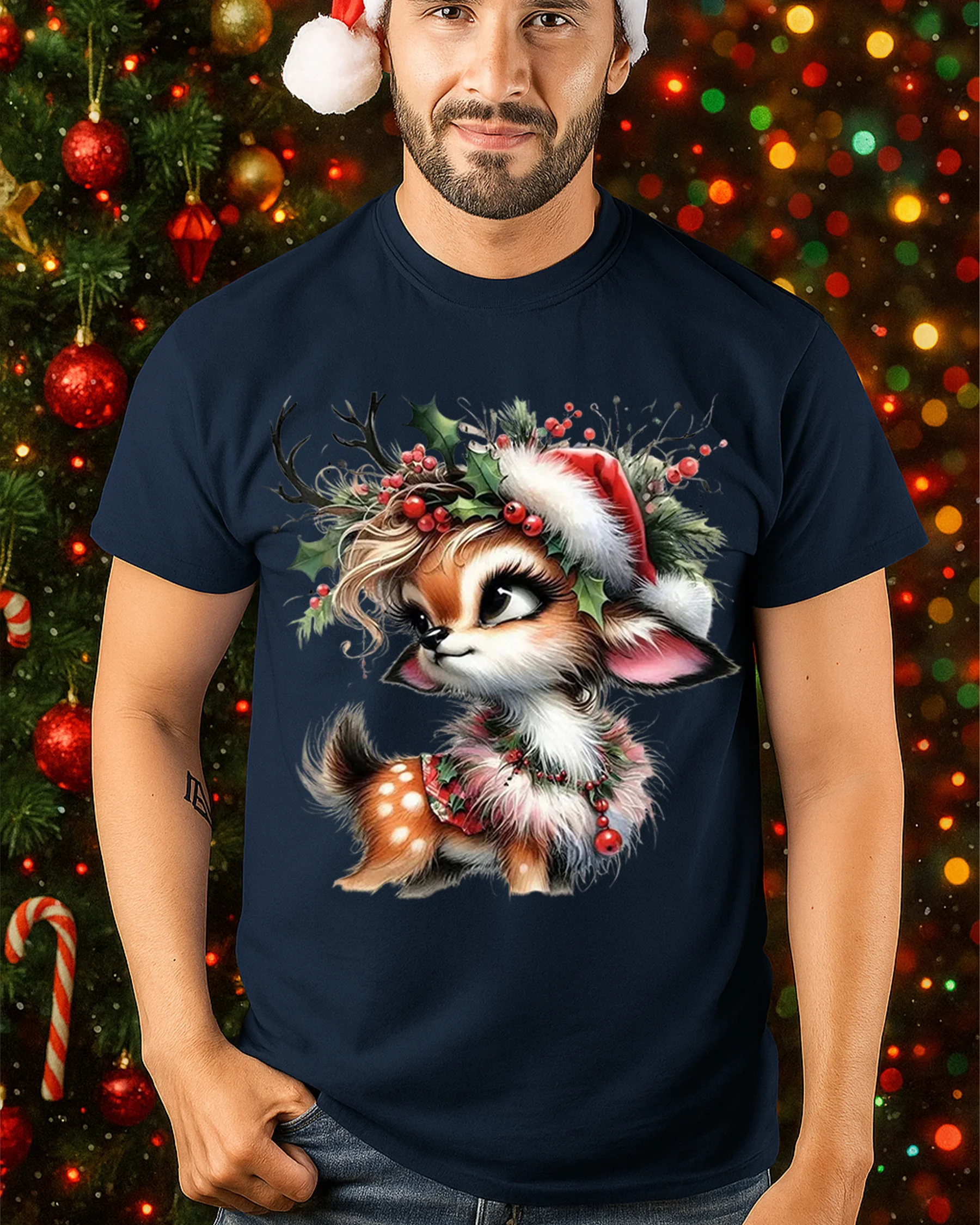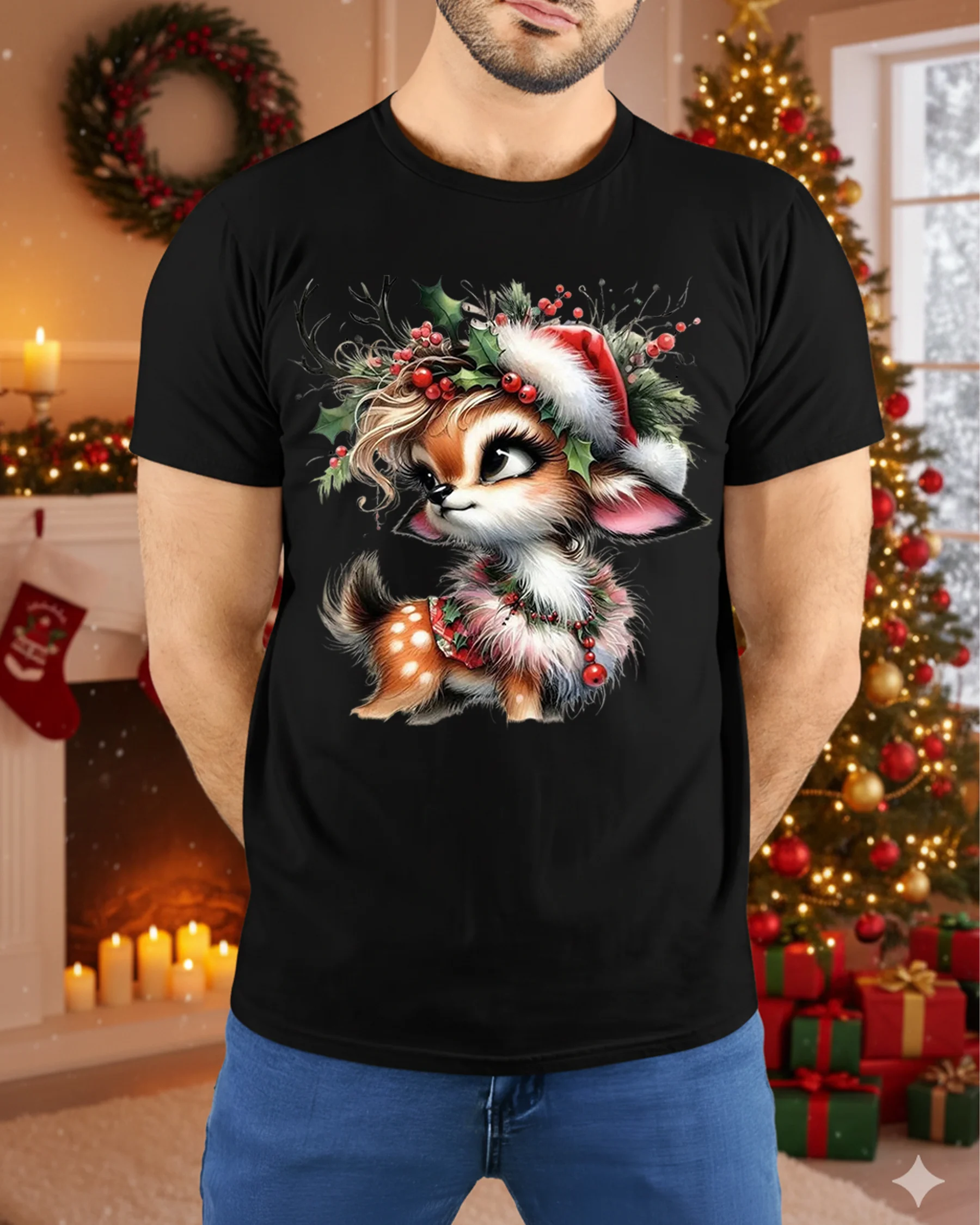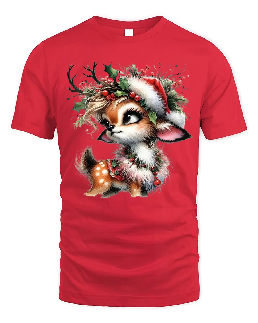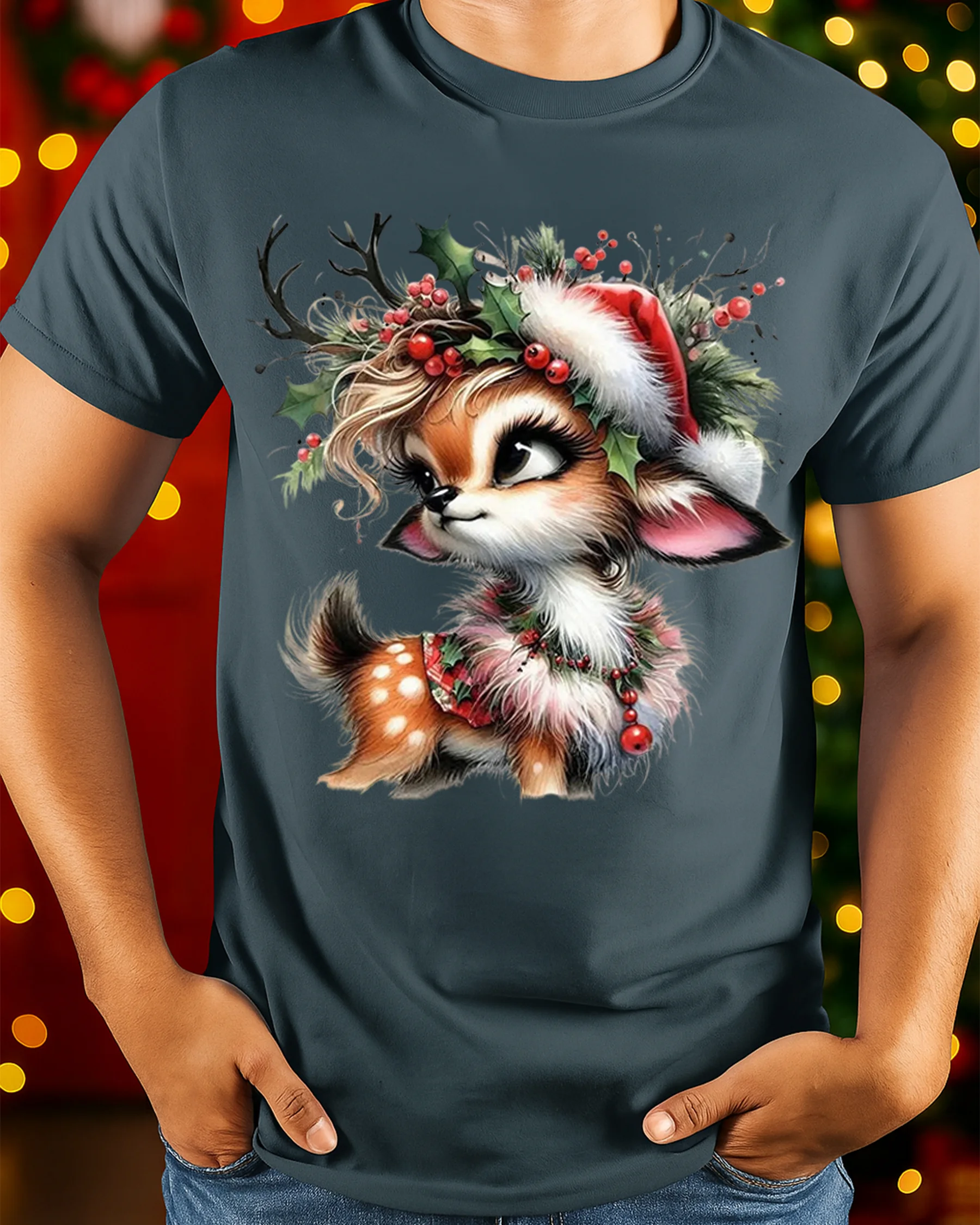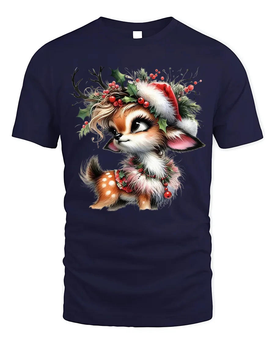 Crafted from soft, high-quality cotton blend fabric, this t-shirt feels gentle against the skin while providing lasting comfort and breathability. The vivid print brings the deer’s charming expression and festive colors to life, ensuring you stand out at every holiday party or family gathering. Whether paired with jeans or layered under a cardigan, it’s perfect for casual outings and seasonal celebrations.