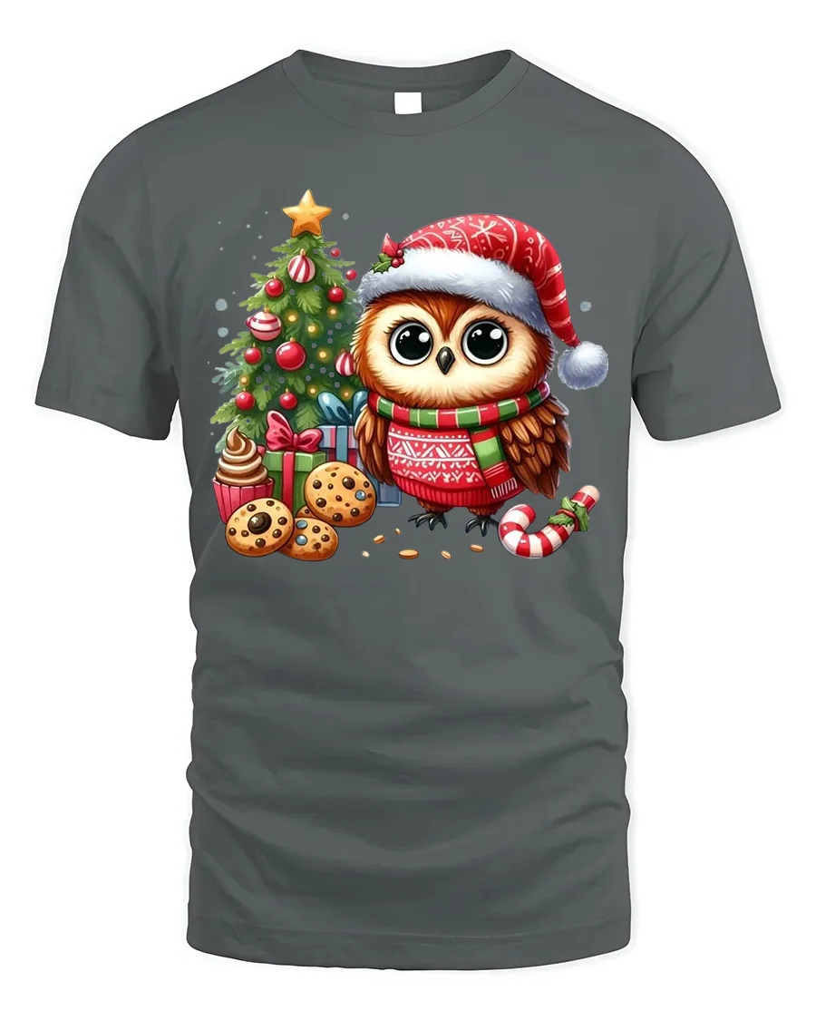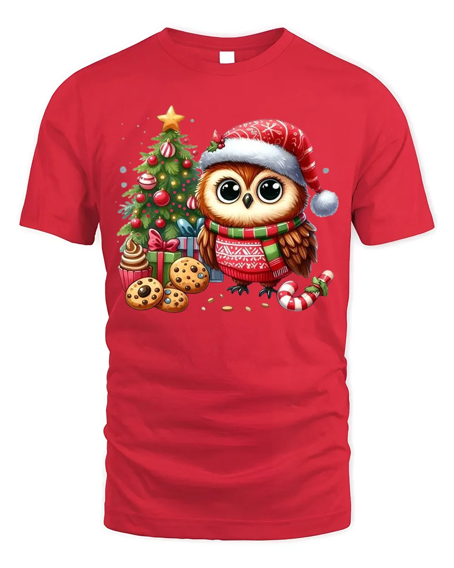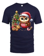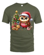 Our Cute Christmas Owl T-Shirt with Tree, Cookies and Holiday Cheer brings festive charm to your winter wardrobe with a design that’s as heartwarming as it is adorable. Featuring a big-eyed owl in a Santa hat and holiday sweater, surrounded by a decorated Christmas tree, gifts, cookies, and candy canes, this tee captures the joyful spirit of the season. Its vibrant colors and delightful details make it perfect for owl lovers and holiday enthusiasts.