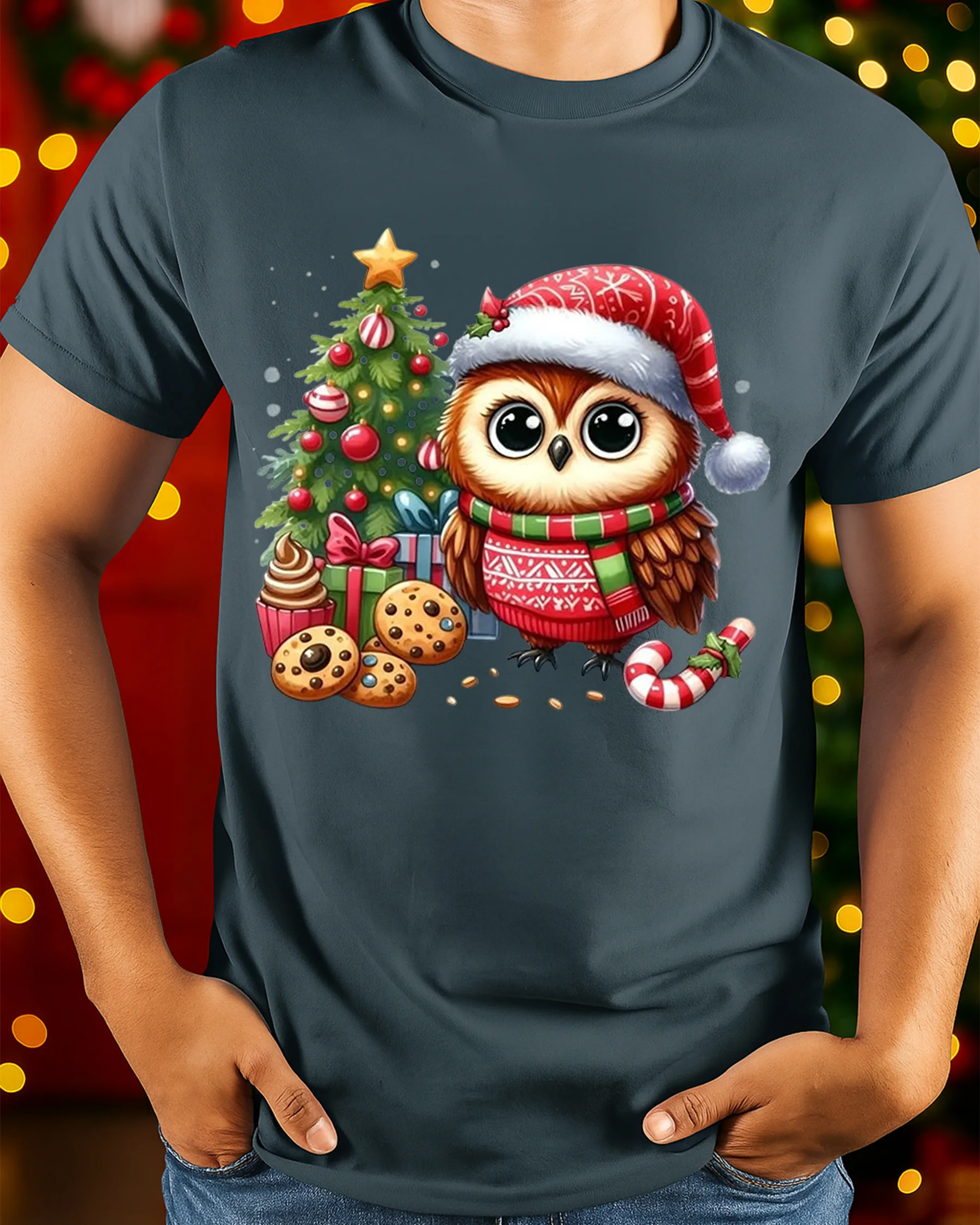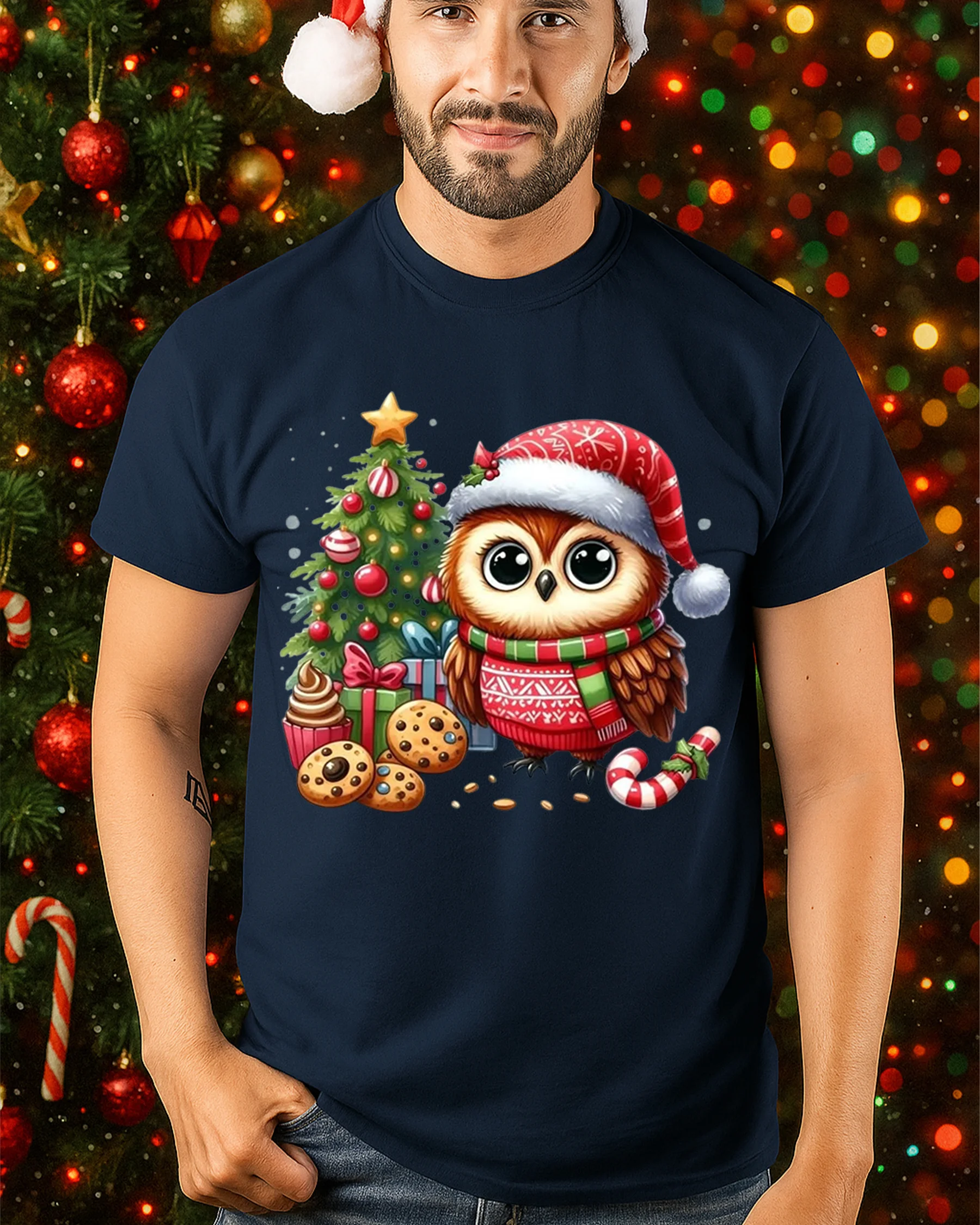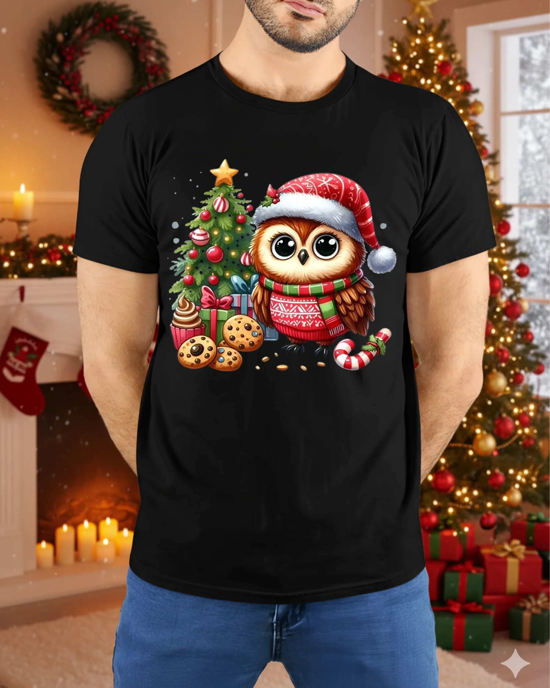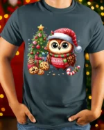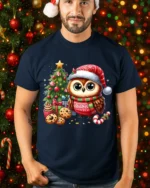 Made from soft, breathable fabric, this t-shirt delivers comfort for all your winter activities—from trimming the tree to holiday gatherings or cozy evenings at home. The high-quality print brings out every detail of the owl’s fluffy feathers, the sparkling ornaments, and the festive treats, ensuring long-lasting color and charm even after repeated wear. Its classic fit pairs easily with jeans, joggers, or layered winter outfits, making it a versatile addition to your holiday collection.
