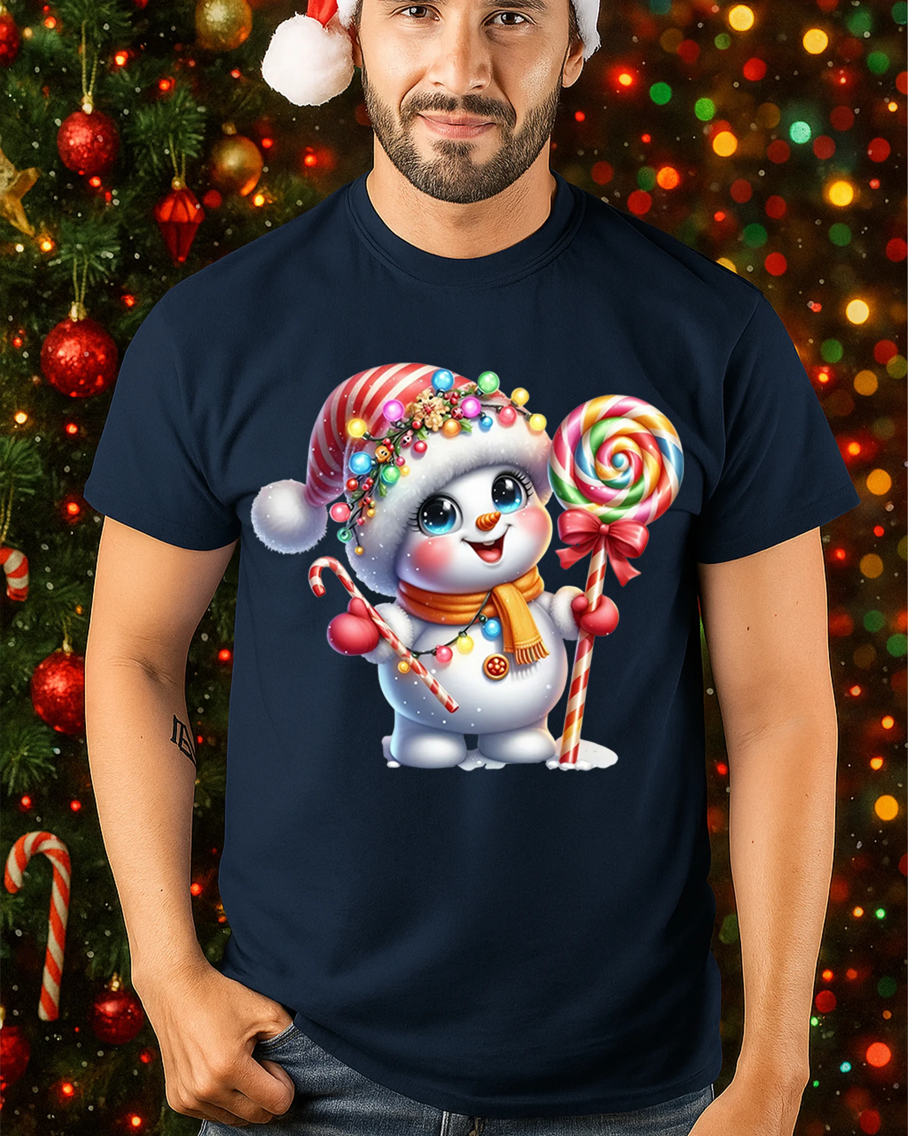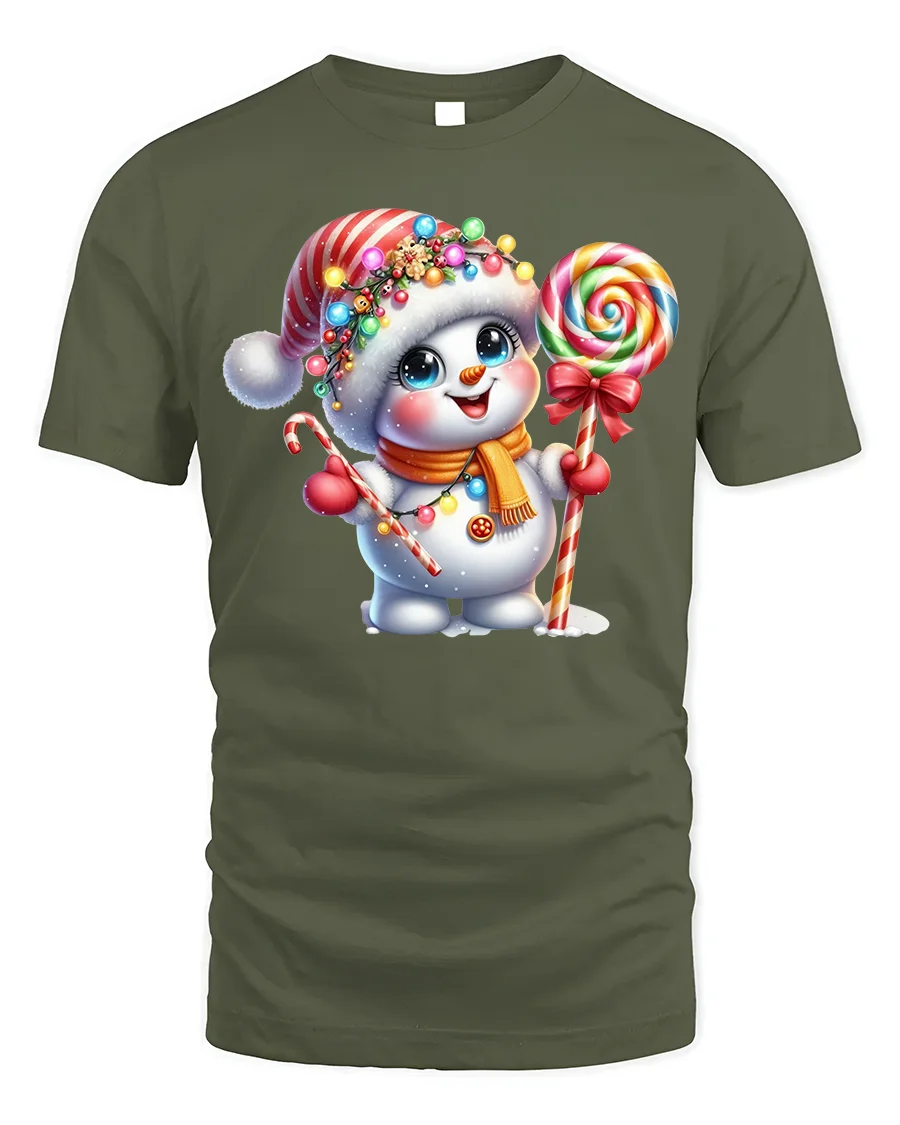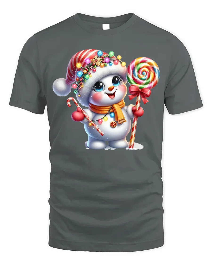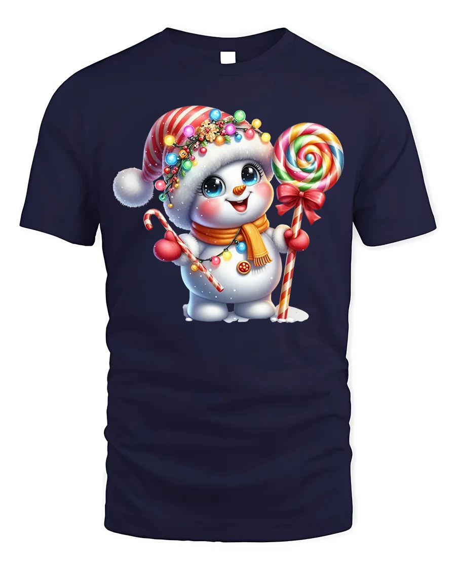 Cute Christmas Snowman T-Shirt with Candy Cane and Lollipop Art