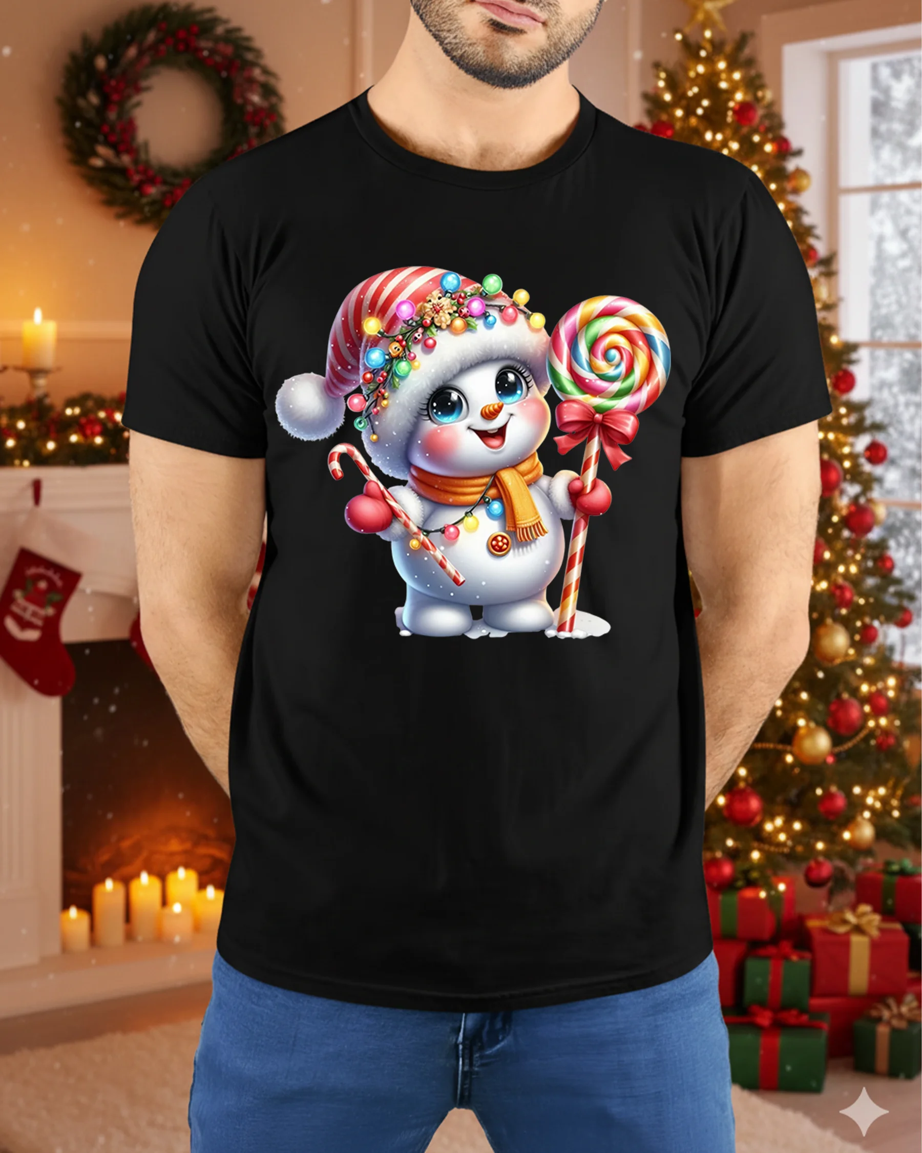 Home Halloween & Noel Cute Christmas Snowman T-Shirt with Candy Cane and Lollipop Art