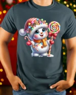 Our Cute Christmas Snowman T-Shirt with Candy Cane and Lollipop Art captures the fun and sweetness of the holiday season with a vibrant and playful design. This adorable snowman, dressed in a striped Santa hat decorated with colorful lights, holds a giant rainbow lollipop and a festive candy cane. With bright eyes, cheerful details, and candy-themed accents, this artwork brings joyful energy to any winter celebration.