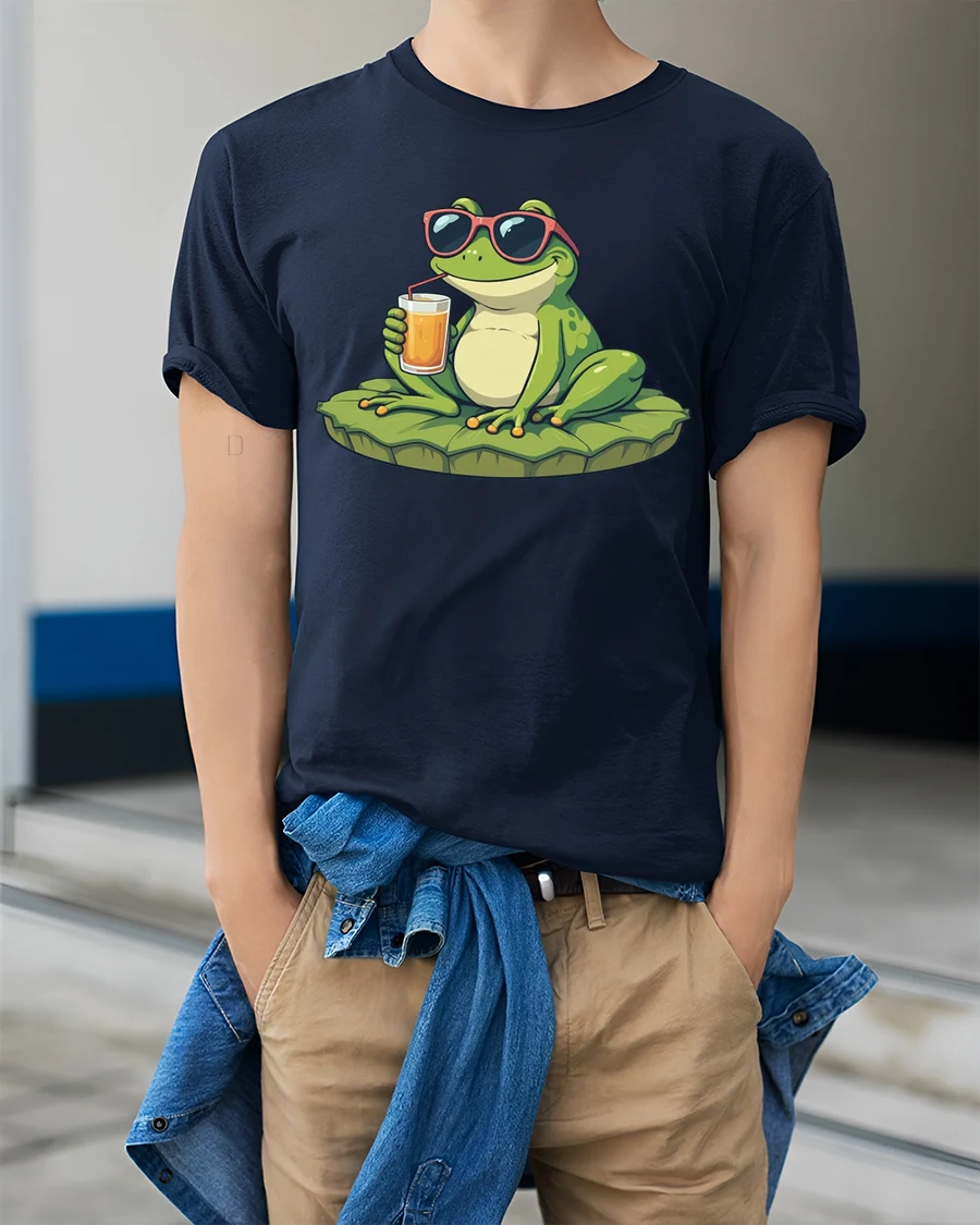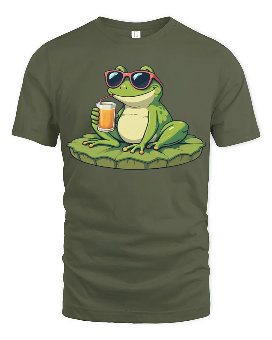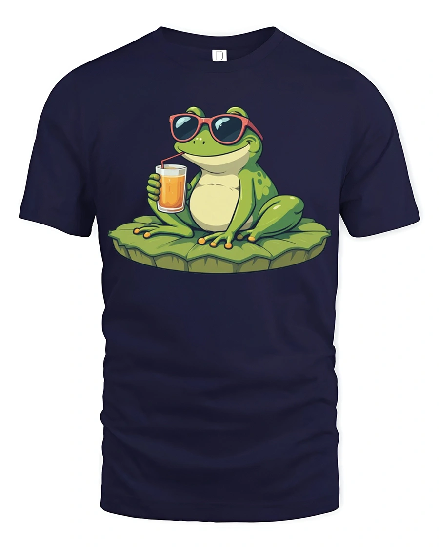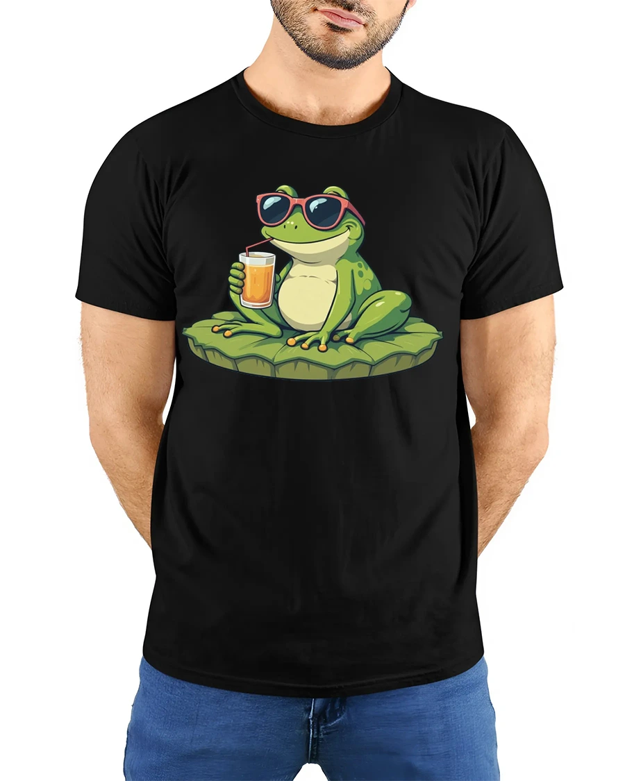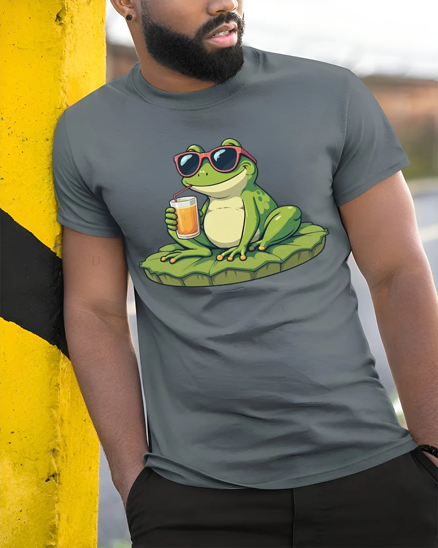 The design features a relaxed frog wearing sunglasses and enjoying a refreshing drink, creating a fun and carefree summer vibe.