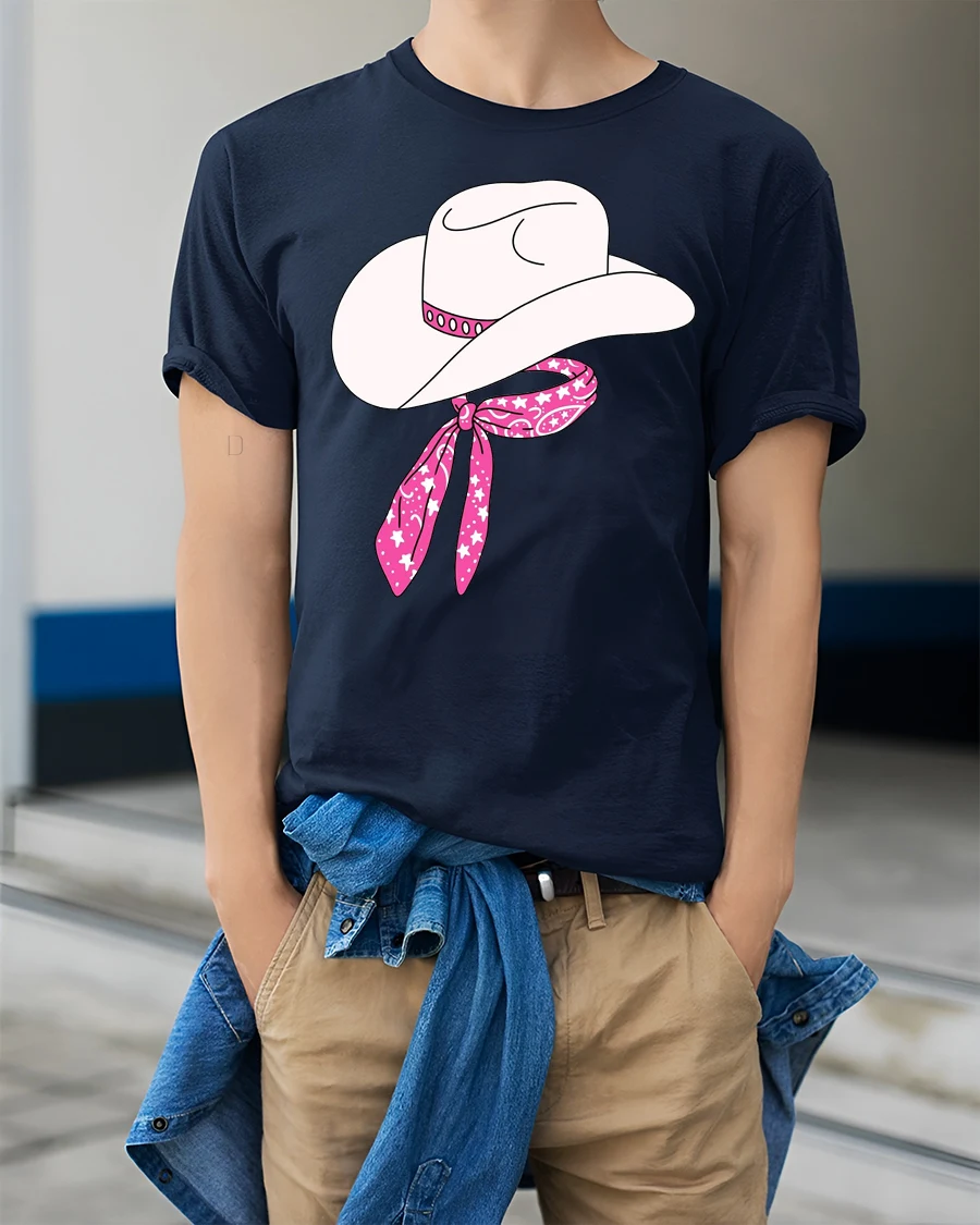 Cute Cowgirl Hat With Pink Bandana Western Style T Shirt - model wearing navy tee with hands in pockets