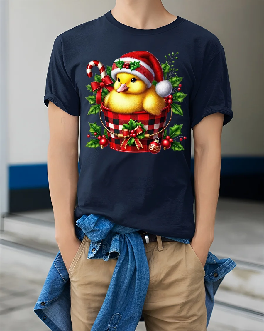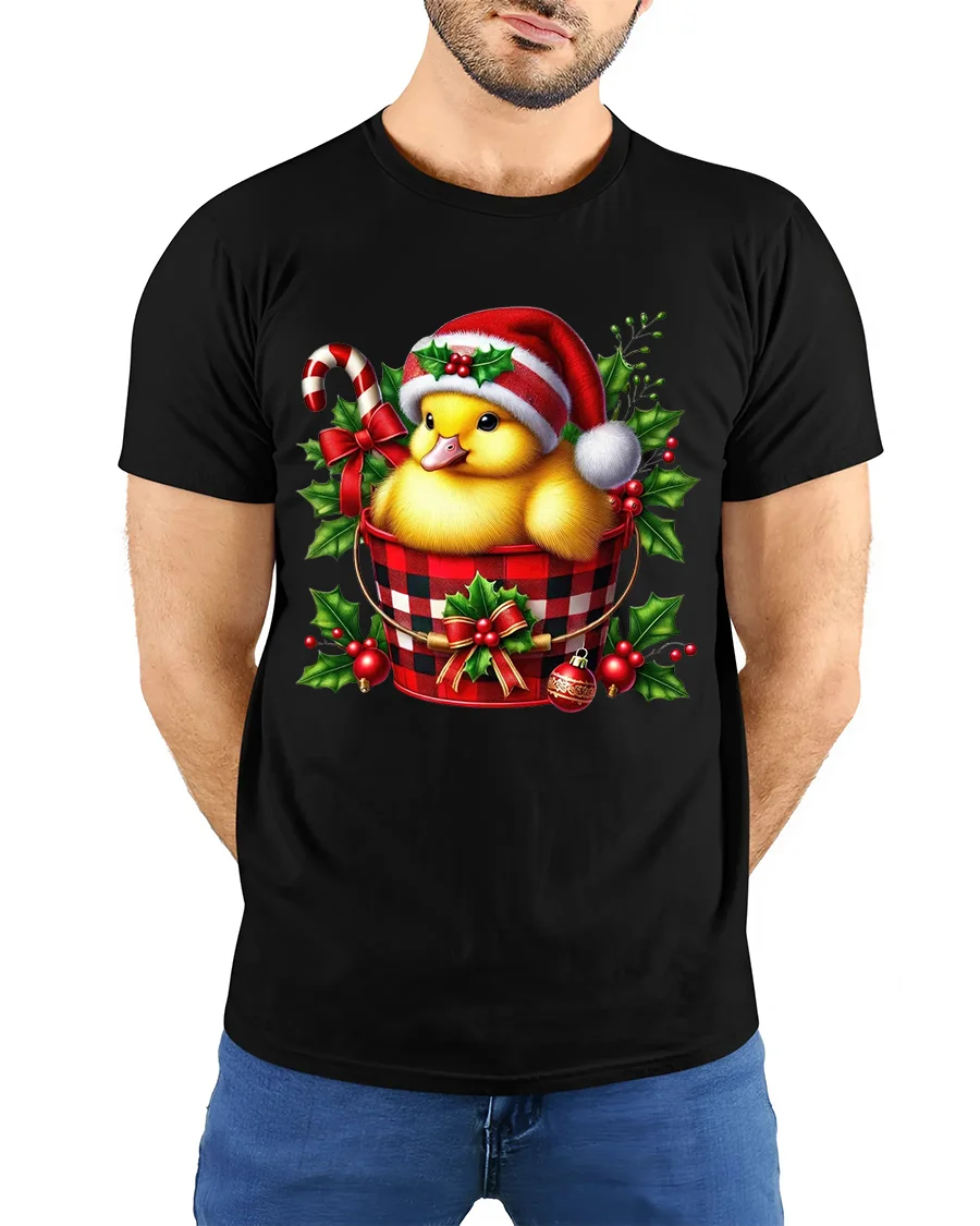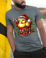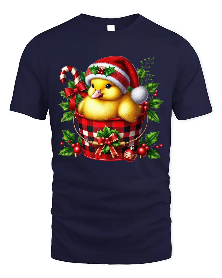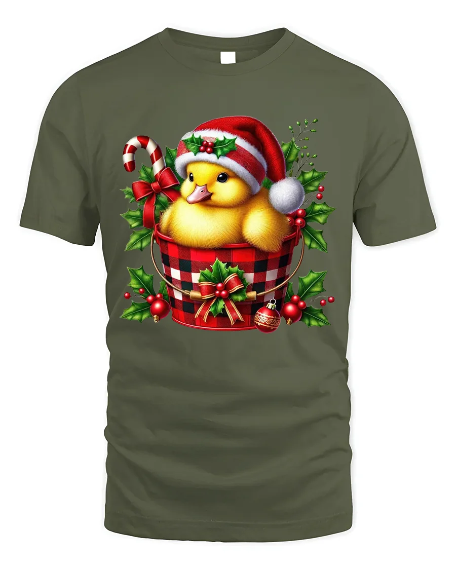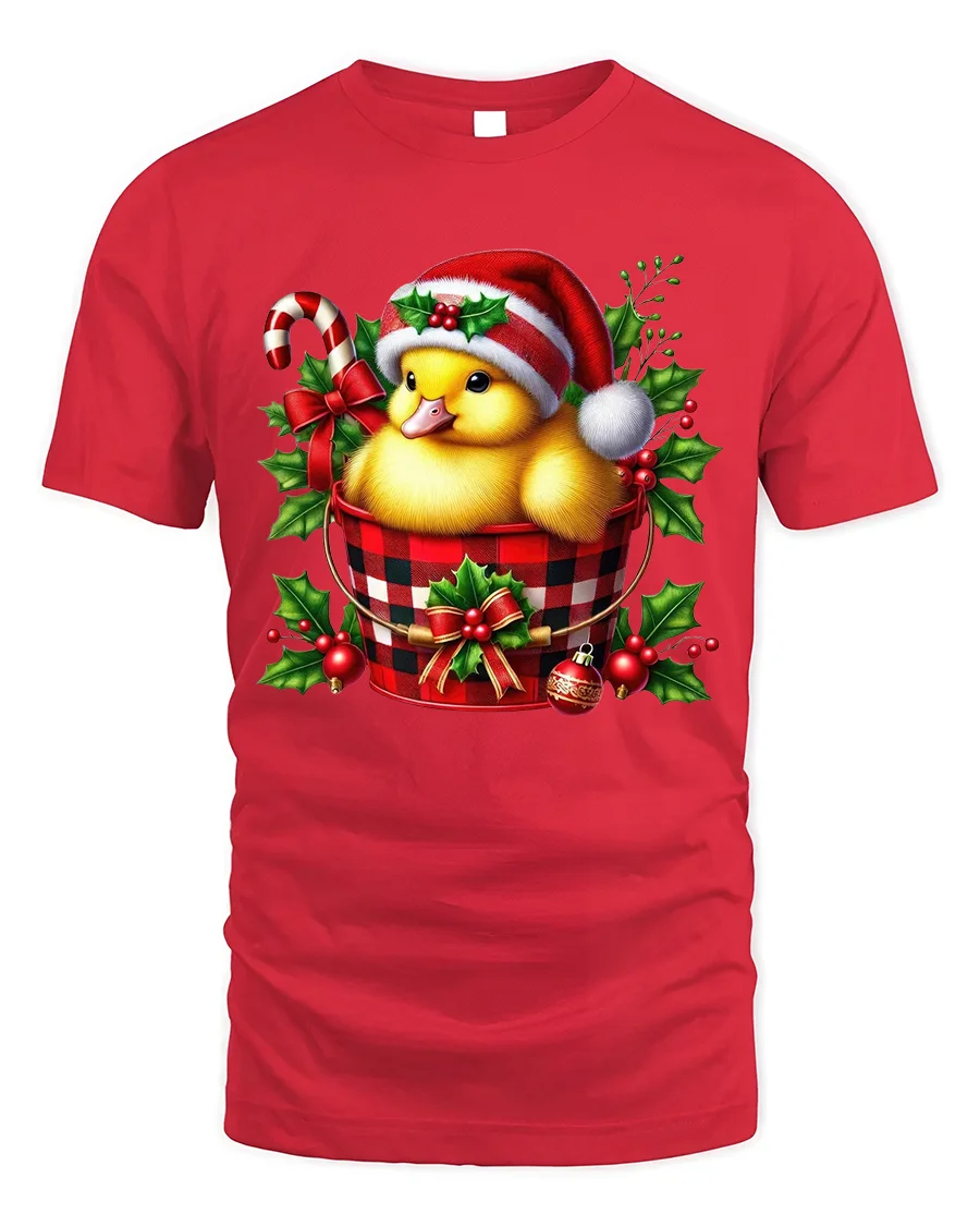 Add a playful touch to your festive wardrobe with the Cute Duck Santa Hat Christmas Candy Cane Holiday Tshirt. This delightful design features an adorable yellow duck dressed in a Santa hat, sitting inside a red plaid basket surrounded by holly leaves, ornaments, and candy canes. It perfectly captures the charm and cheer of the holiday season in a fun and heartwarming way.