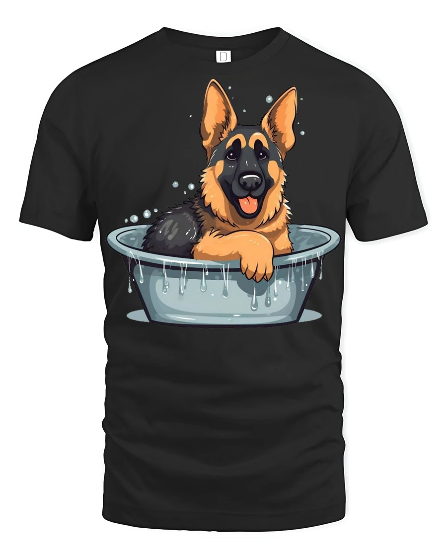 The design features an adorable German Shepherd enjoying bath time, creating a charming and heartwarming visual.