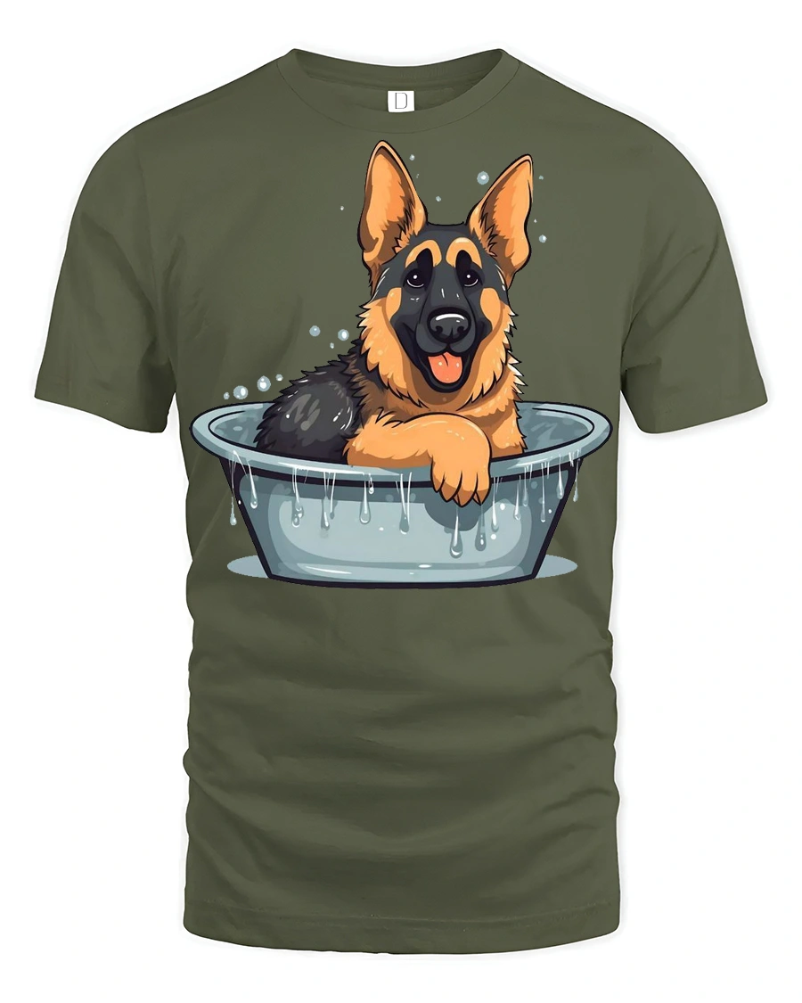 Cute German Shepherd Bath Time Funny Dog Graphic T Shirt - military green t-shirt on white background