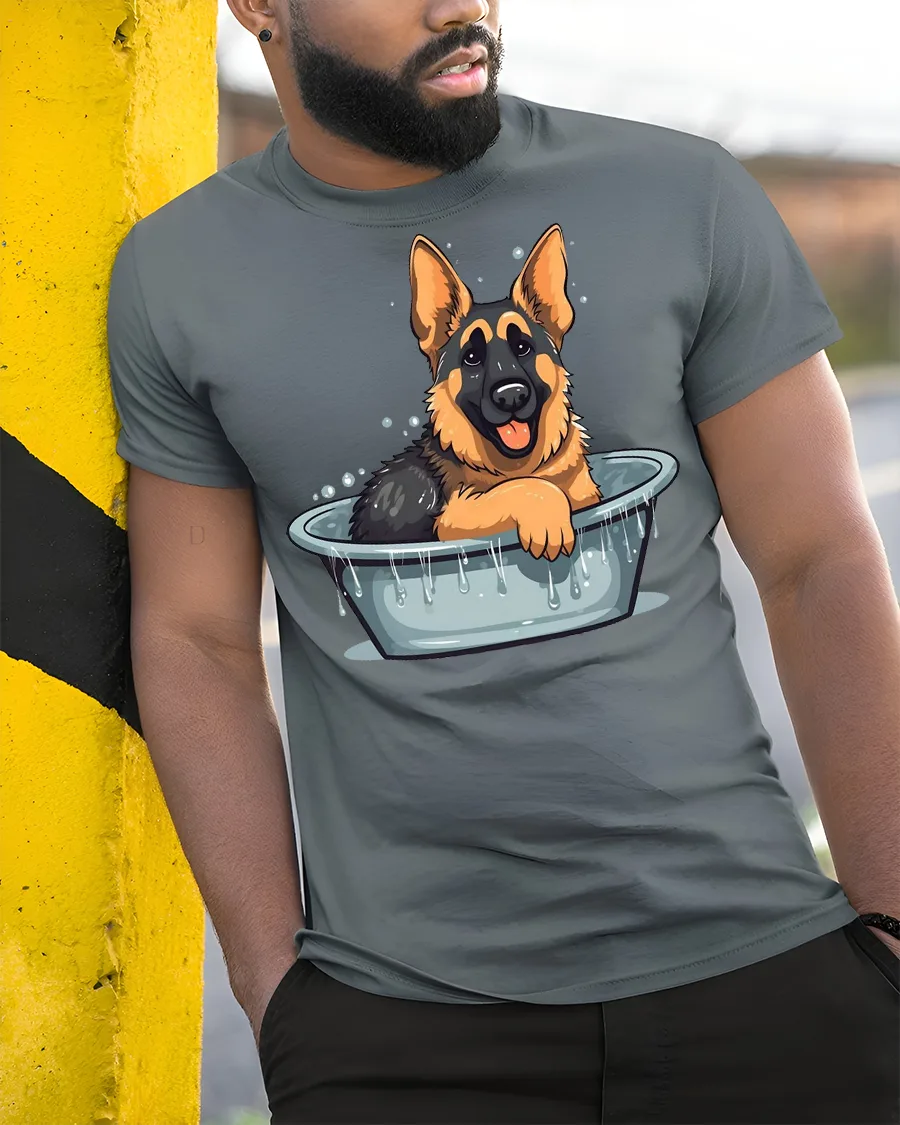 Cute German Shepherd Bath Time Funny Dog Graphic T Shirt captures a joyful and playful moment that every dog lover can appreciate.