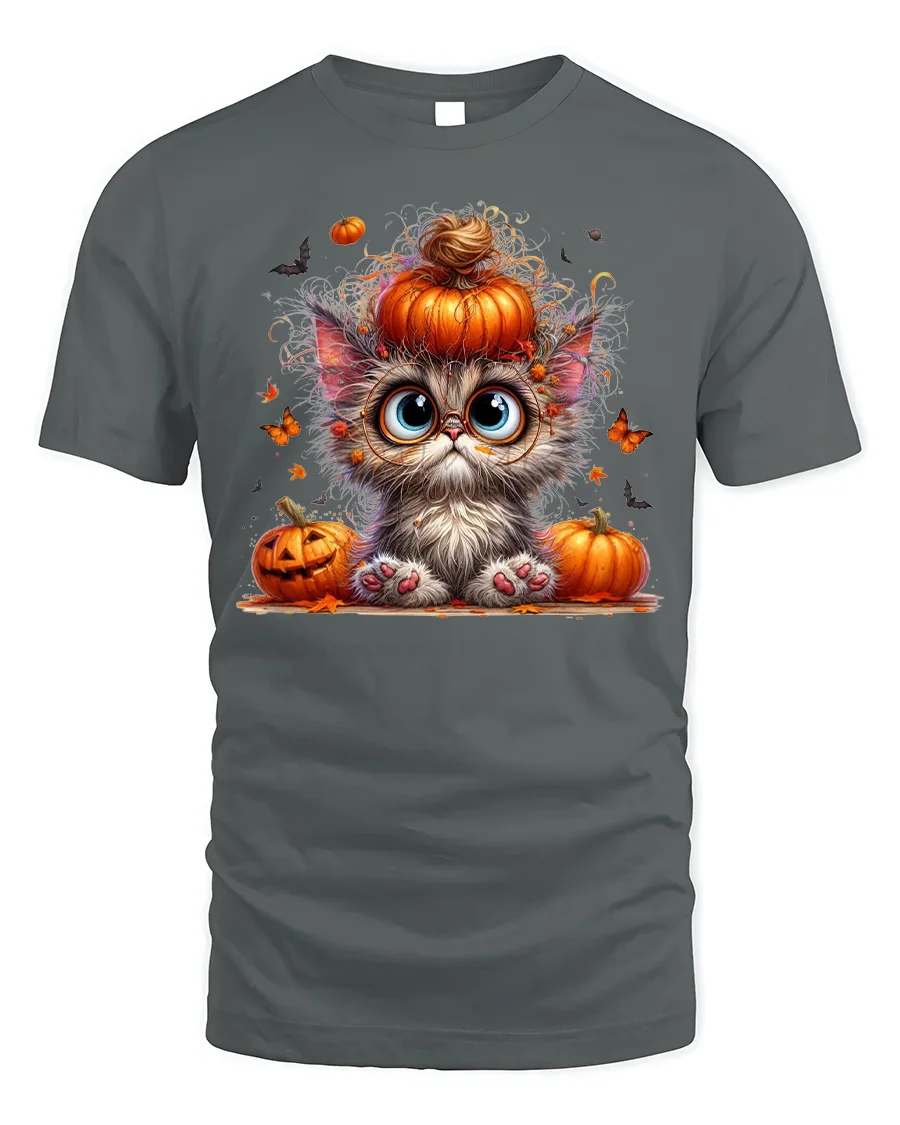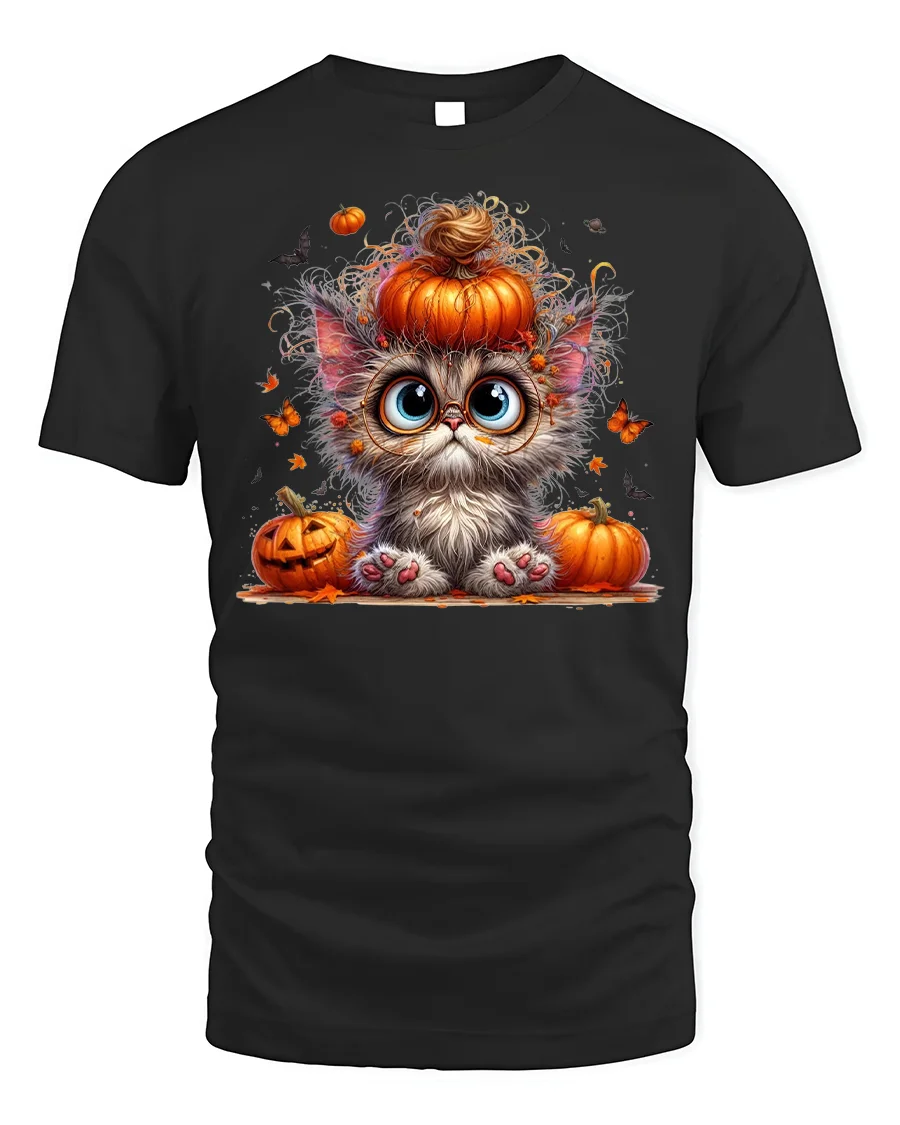Cute Halloween Kitten Pumpkin Graphic T-Shirt is the perfect mix of spooky fun and adorable charm for your Halloween wardrobe. This unique design features a wide-eyed fluffy kitten wearing a pumpkin hat, surrounded by glowing jack-o’-lanterns and falling autumn leaves. The artwork blends creepy-cute style with festive Halloween spirit, making it a standout piece for animal lovers and holiday fans alike.