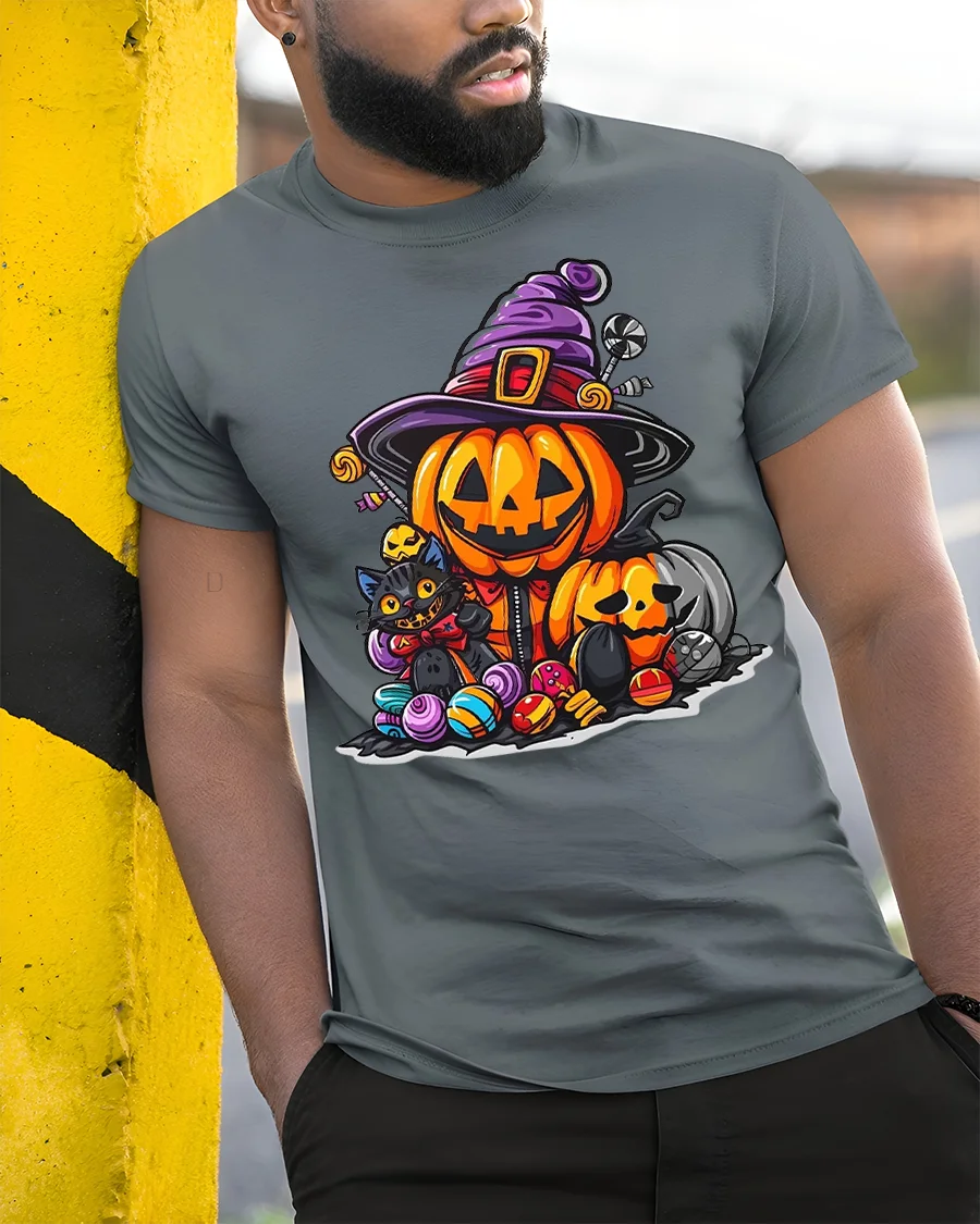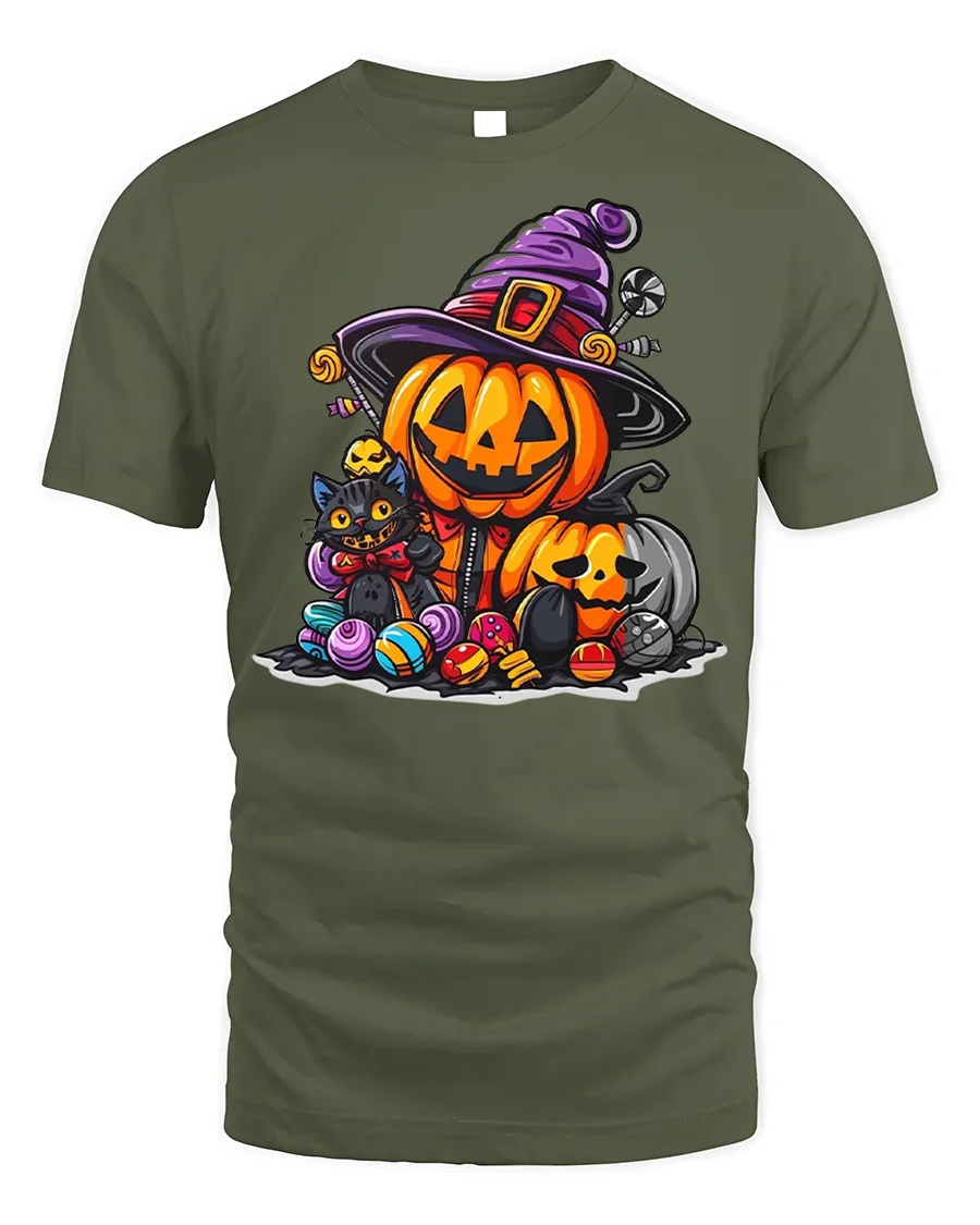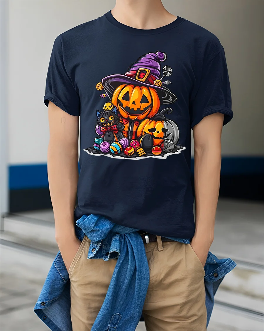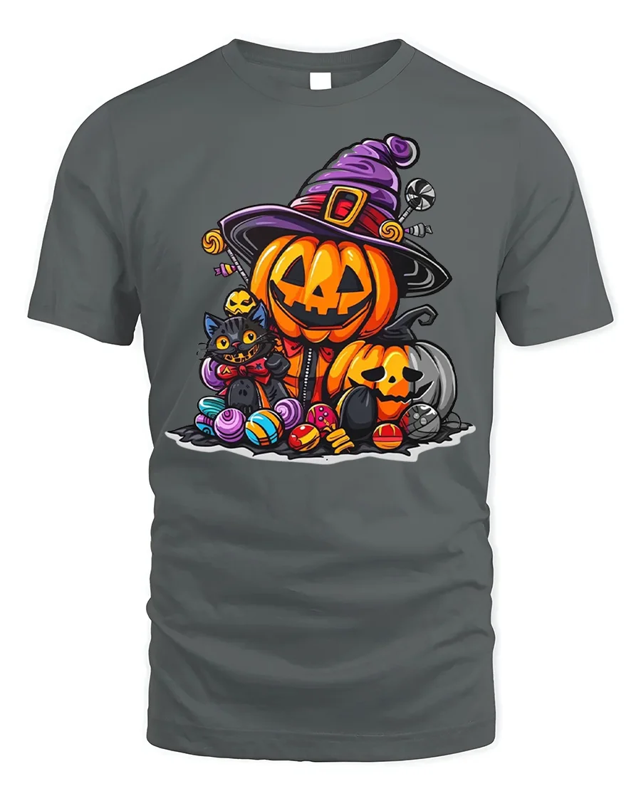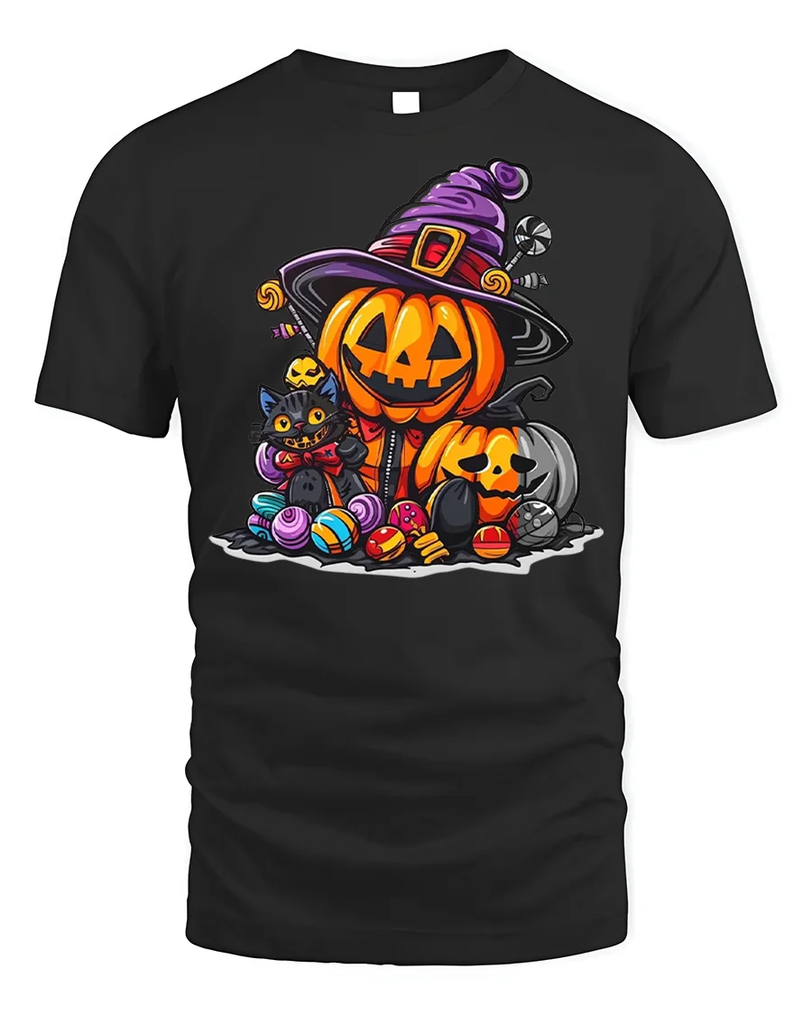 Featuring a cheerful jack-o-lantern wearing a witch hat, surrounded by colorful candies and a mischievous black cat, this Halloween graphic tee captures the playful spirit of October nights.