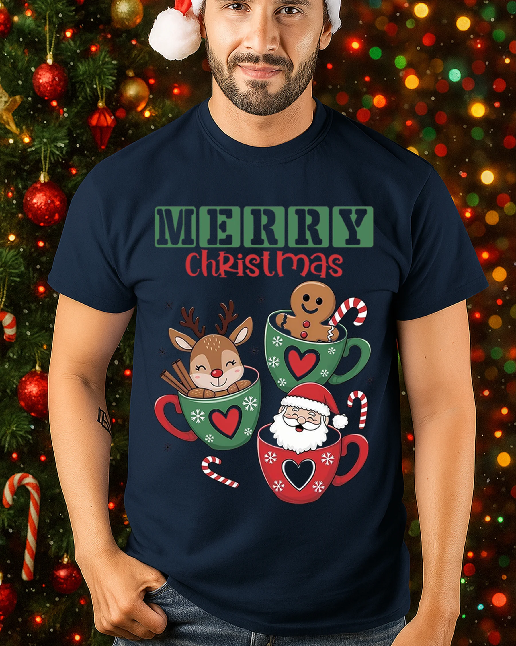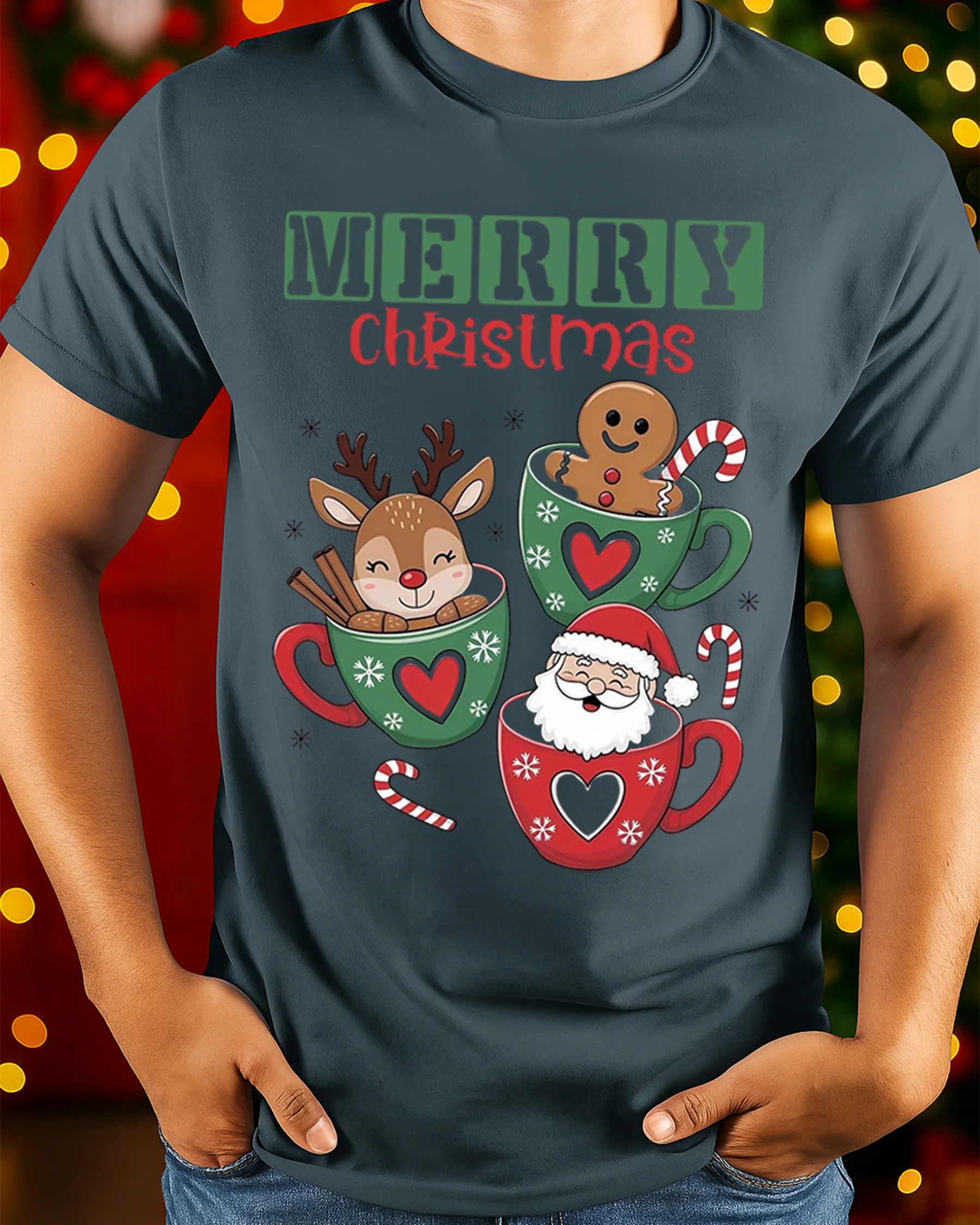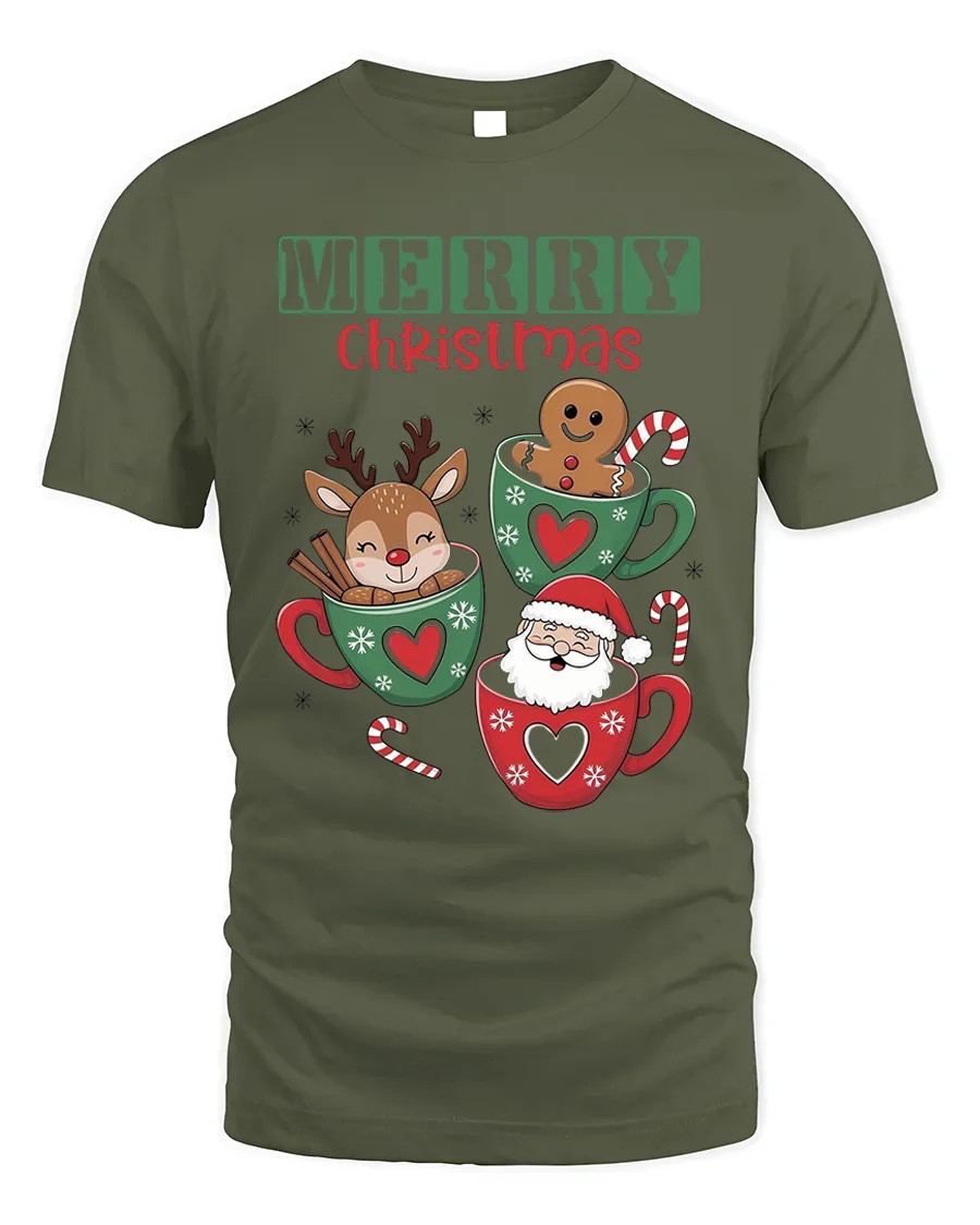 Celebrate the sweetness of the holidays with this Cute Merry Christmas T-Shirt Santa Reindeer Gingerbread Tee. Featuring a heartwarming design of Santa, a reindeer, and a gingerbread man sitting in festive mugs surrounded by candy canes and snowflakes, this shirt perfectly captures the cheerful and cozy vibes of Christmas. It’s a fun and adorable way to spread joy throughout the season.