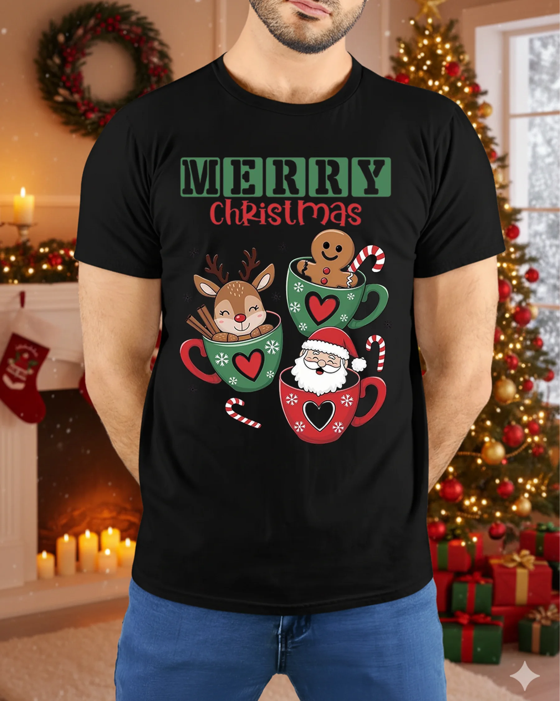 Crafted from soft, premium cotton blend fabric, this t-shirt offers lasting comfort and a flattering fit for all-day wear. The colorful and detailed print stands out beautifully against the dark background, making it perfect for family gatherings, Christmas parties, or relaxing at home with hot cocoa. Whether you’re decking the halls or watching holiday movies, this tee keeps your look festive and bright.