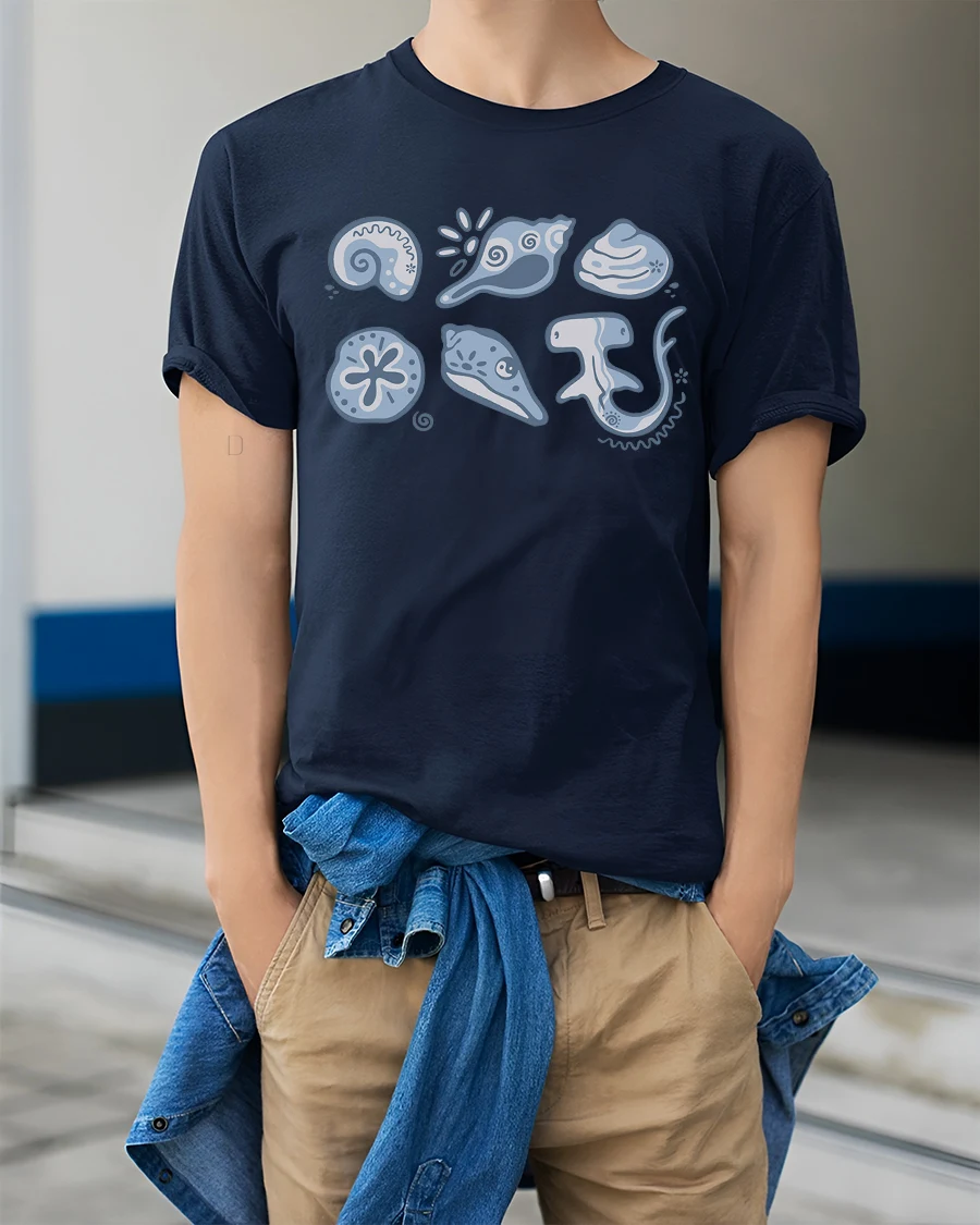 Cute Ocean Creatures Graphic Tee Minimal Marine Life Tshirt - model wearing navy tee with hands in pockets