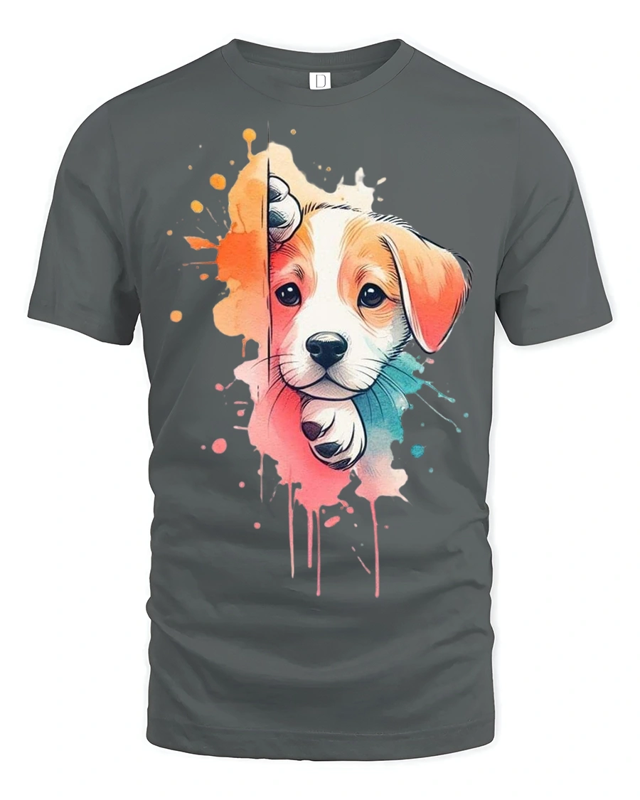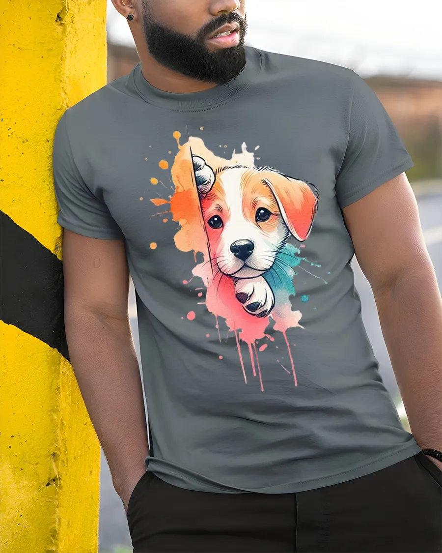 Cute Puppy Splash Art Graphic T Shirt Colorful Dog Lover Tee features an adorable puppy design blended with vibrant splash paint effects that create a playful and artistic look. The charming expression and soft color transitions make this tshirt instantly eye catching and heartwarming.