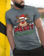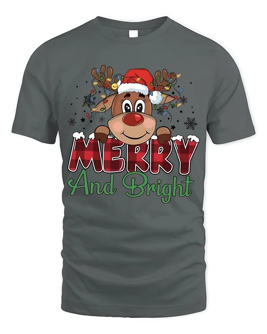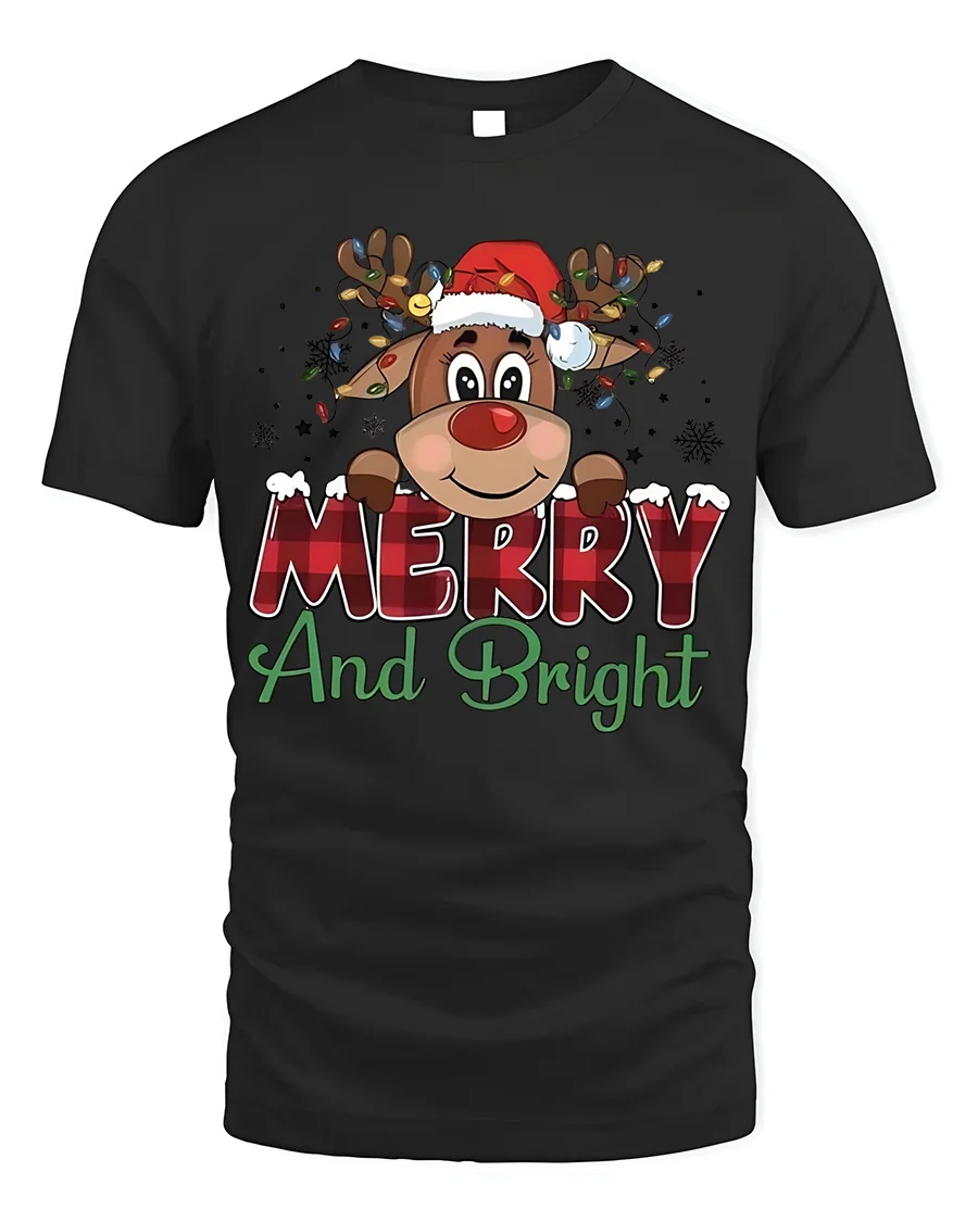 Add a touch of joy to your festive wardrobe with this Cute Reindeer Merry And Bright Christmas Holiday T-Shirt. Featuring an adorable red-nosed reindeer wearing a Santa hat and surrounded by colorful Christmas lights, this design perfectly captures the warmth, fun, and sparkle of the season. It’s a cheerful and stylish way to celebrate the most wonderful time of the year.
