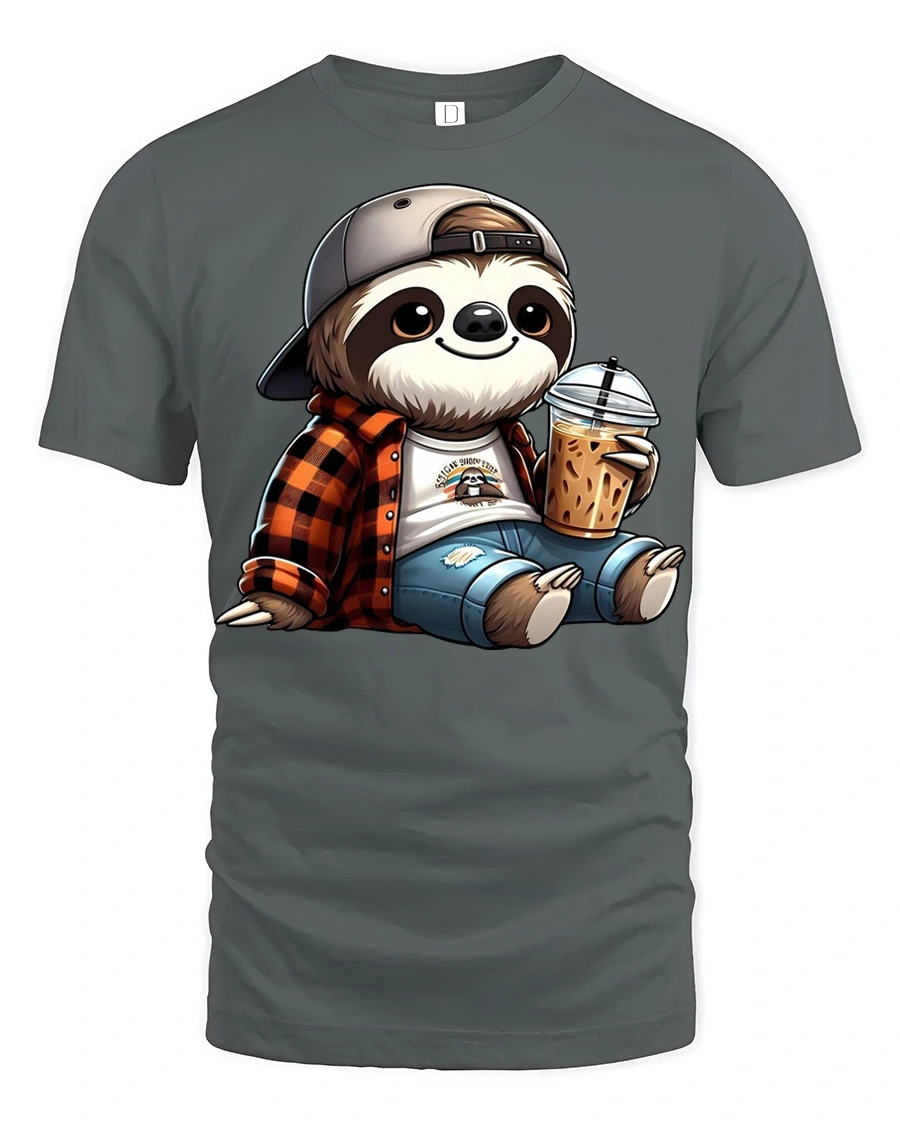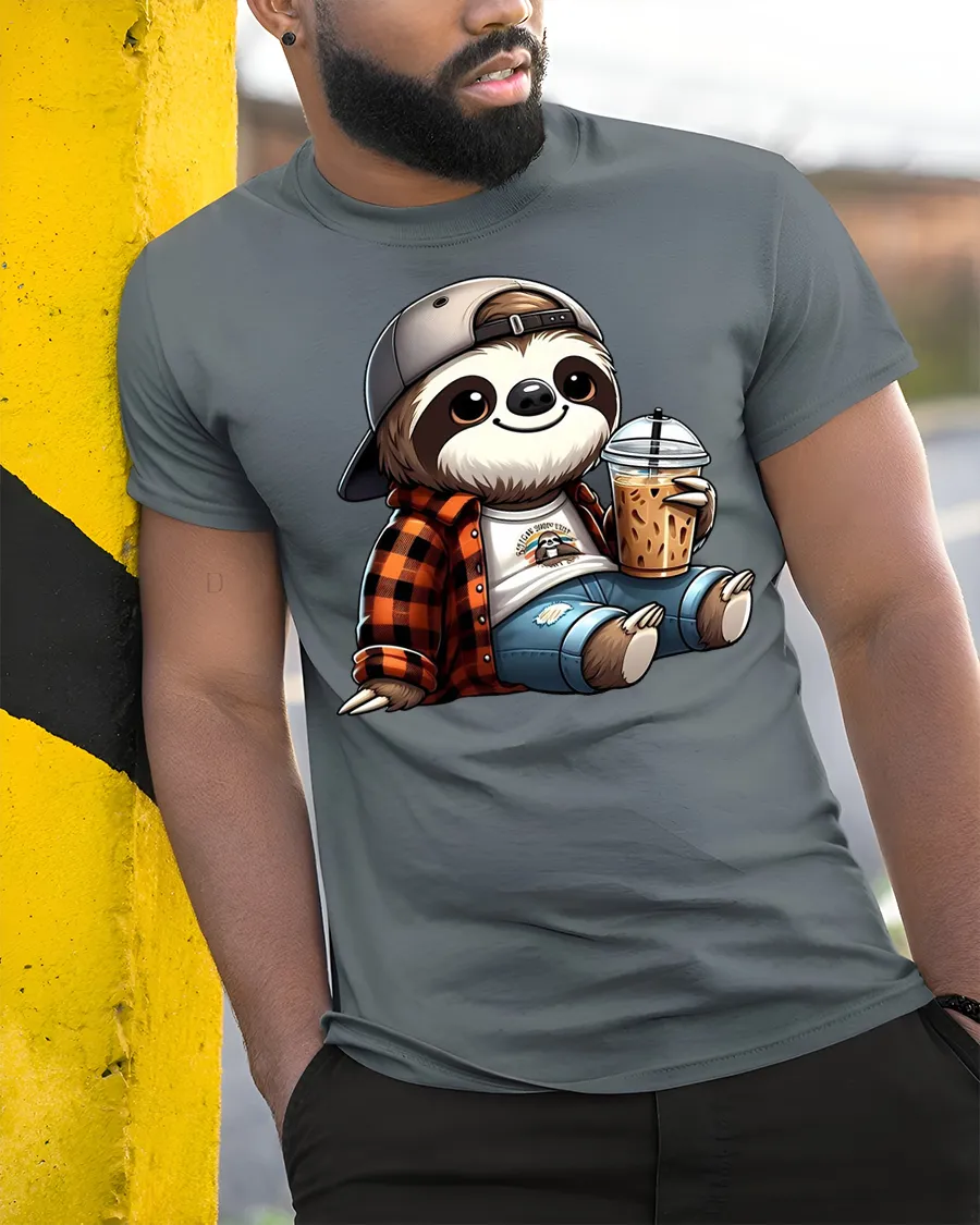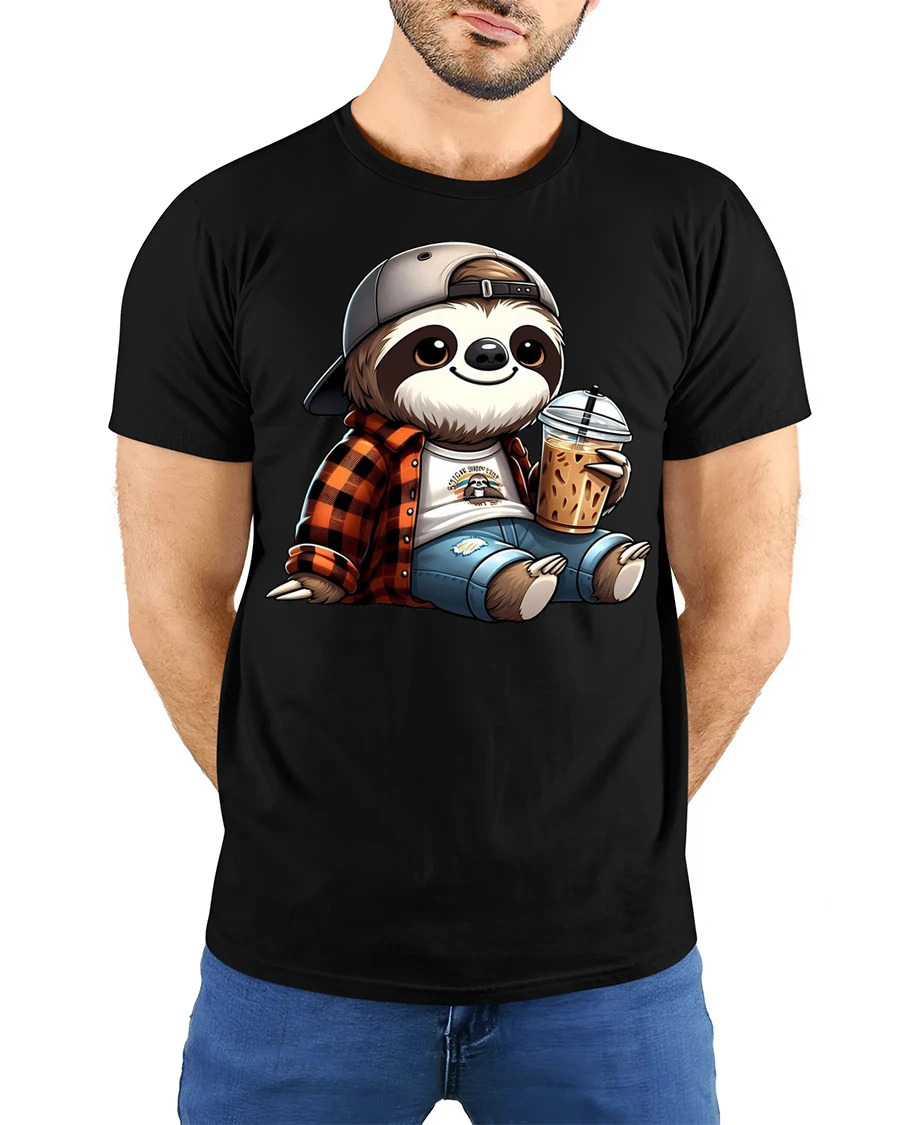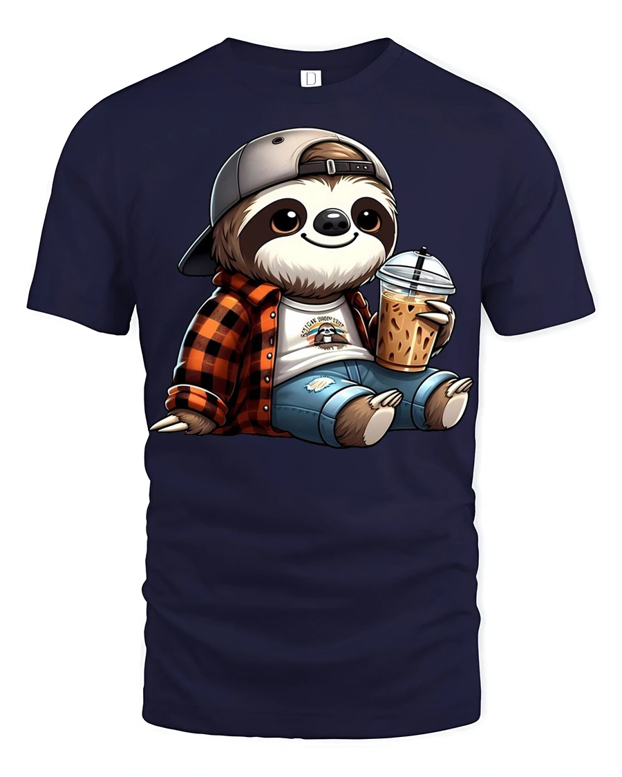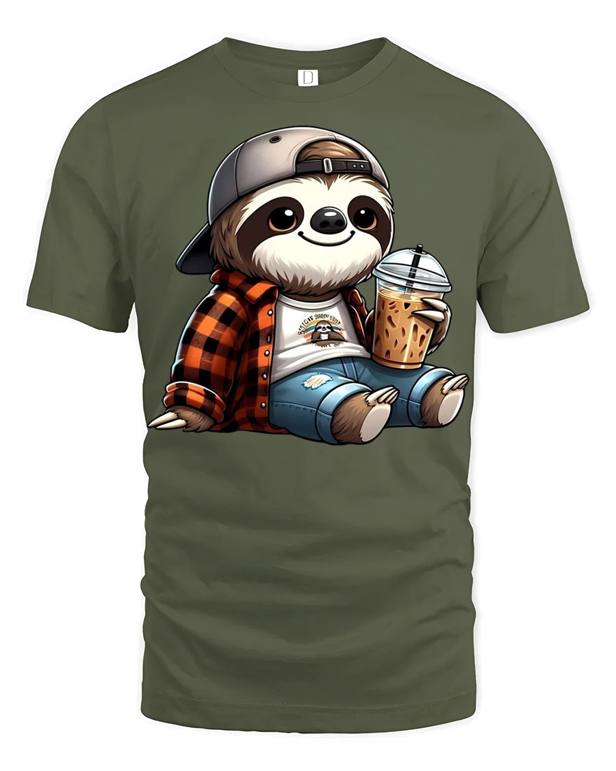 Featuring a charming sloth holding an iced coffee with a laid back expression, this tee captures a cozy and fun mood.