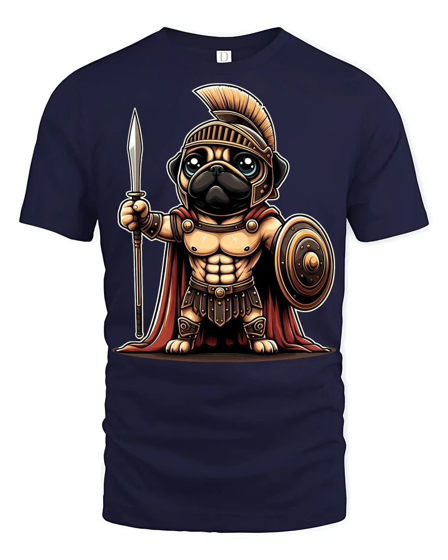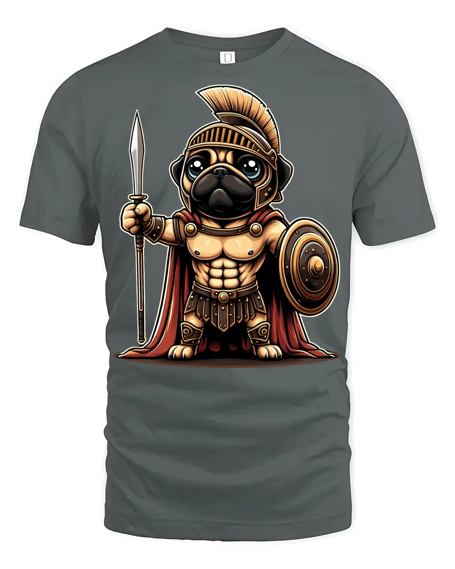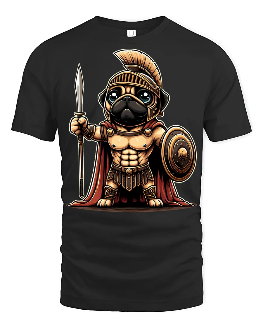 Featuring a cute pug dressed as a Spartan warrior with armor shield and spear, this graphic blends humor and strength into one unique visual.