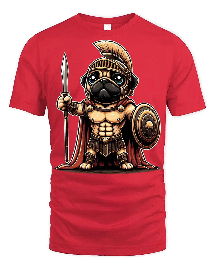 Cute Spartan Pug Warrior Graphic T Shirt Funny Ancient Hero Style - red t-shirt on white background