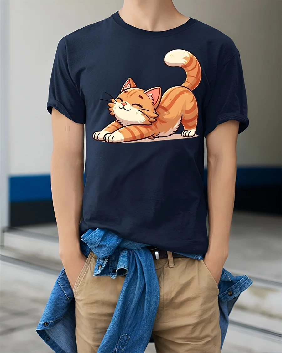 Cute Stretching Cat Graphic T Shirt Funny Relaxed Kitty Style Tee - model wearing navy tee with hands in pockets