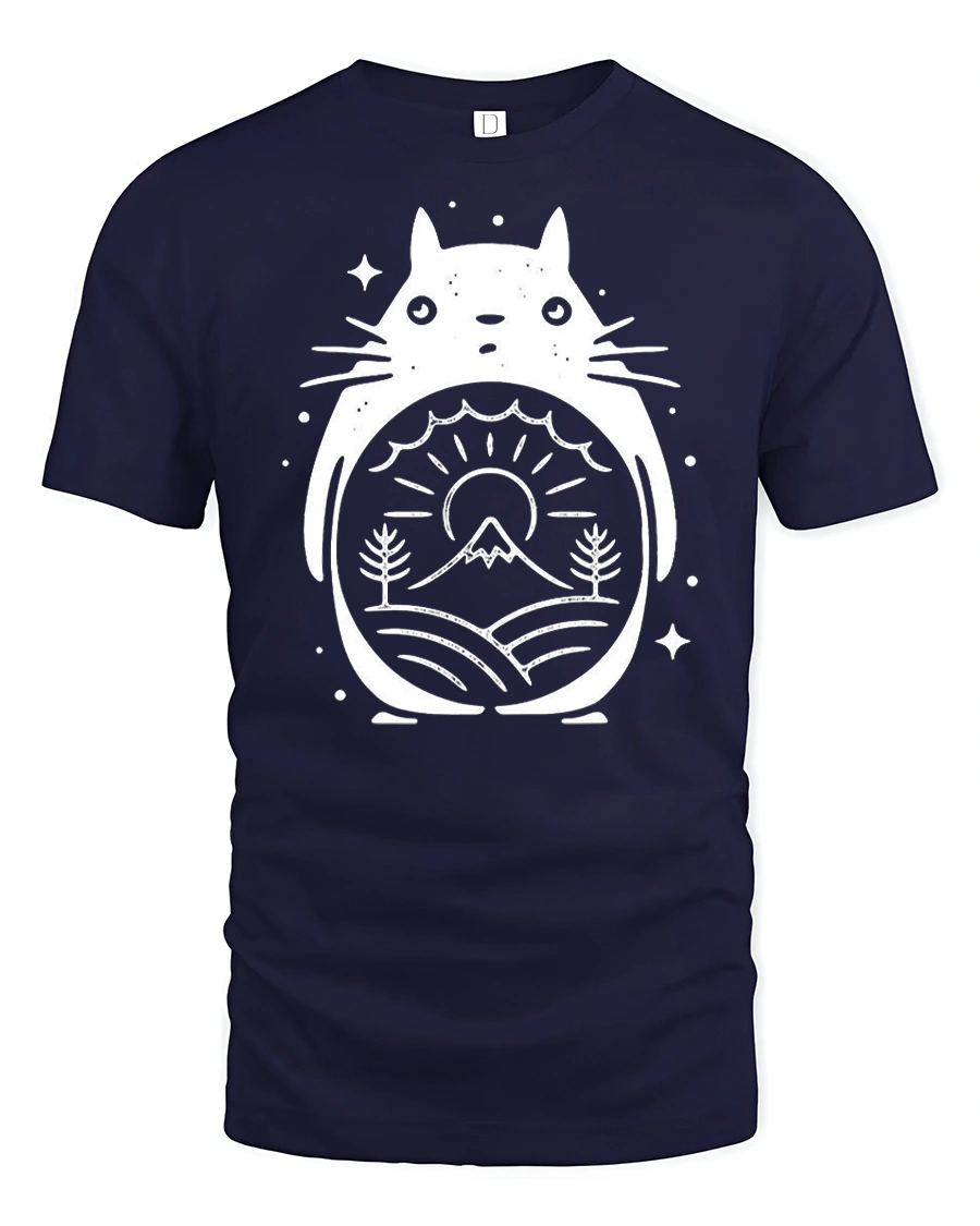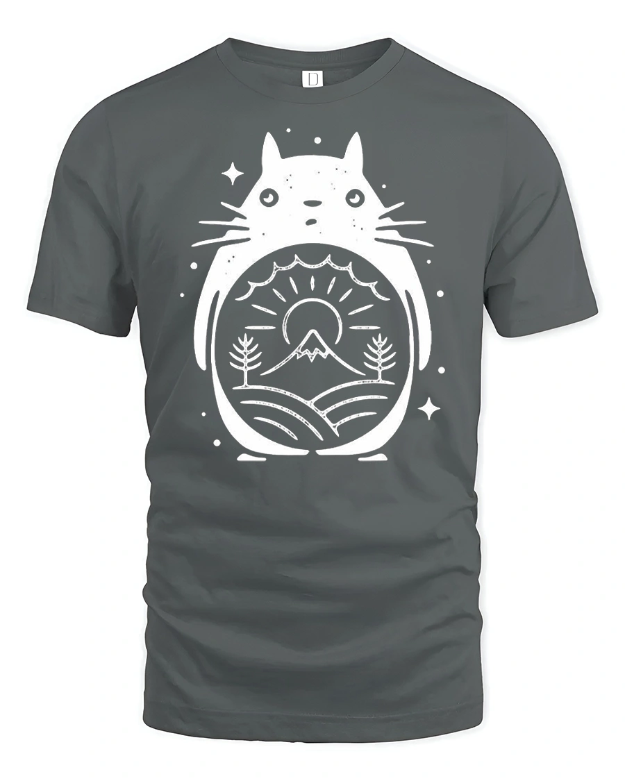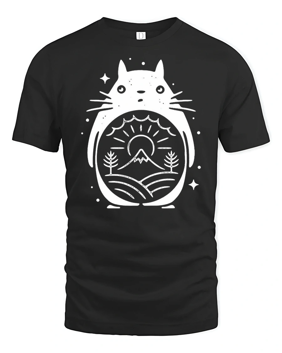 Cute Totoro Style Forest Graphic Tee Nature Spirit Tshirt presents a charming artistic design that blends imagination with peaceful landscape inspiration. The whimsical forest creature illustration surrounds a scenic mountain and sunrise composition, creating a calm and magical atmosphere that reflects connection with nature and creativity. This nature inspired artwork expresses warmth, curiosity, and gentle personality through clean visual storytelling.