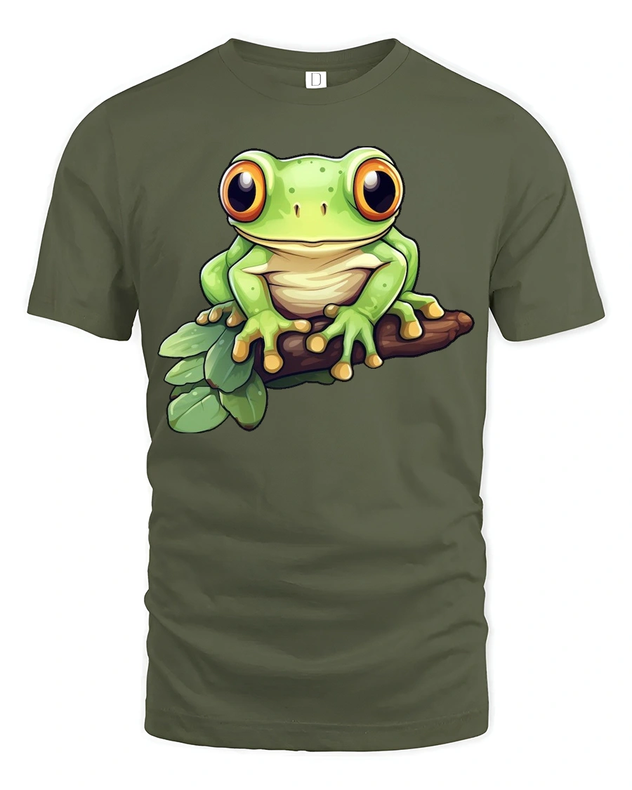 Cute Tree Frog Cartoon Nature Wildlife Graphic Tee Tshirt - military green t-shirt on white background