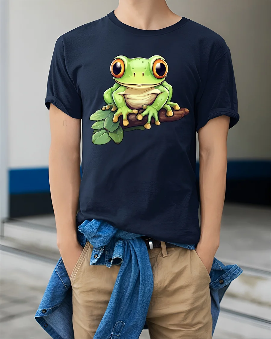 Cute Tree Frog Cartoon Nature Wildlife Graphic Tee Tshirt - model wearing navy tee with hands in pockets