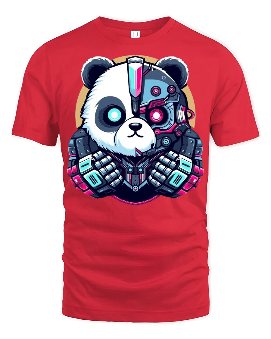 Cyberpunk Panda Robot Graphic T Shirt Futuristic Tech Style - red t-shirt on white background