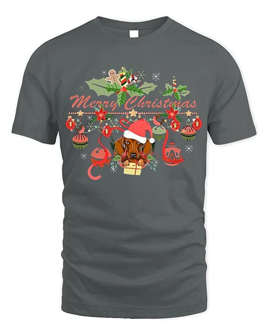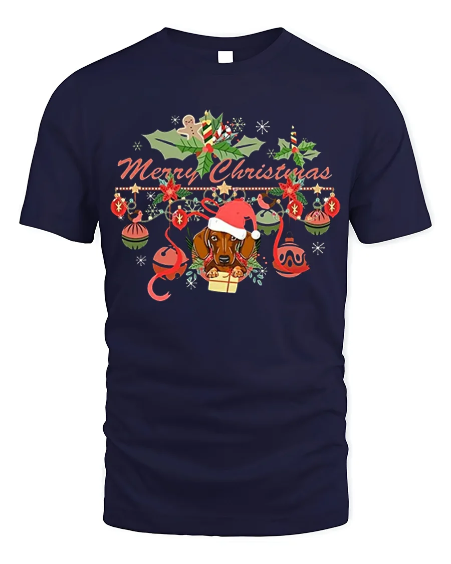 Celebrate the holidays with your favorite furry friend in the Dachshund Dog Merry Christmas Lights Holiday Gift T-Shirt. Featuring an adorable dachshund wearing a Santa hat surrounded by festive ornaments, holly, and candy canes, this cheerful design is perfect for any dog lover who wants to spread Christmas joy. It’s a fun and heartwarming way to show off your holiday spirit.