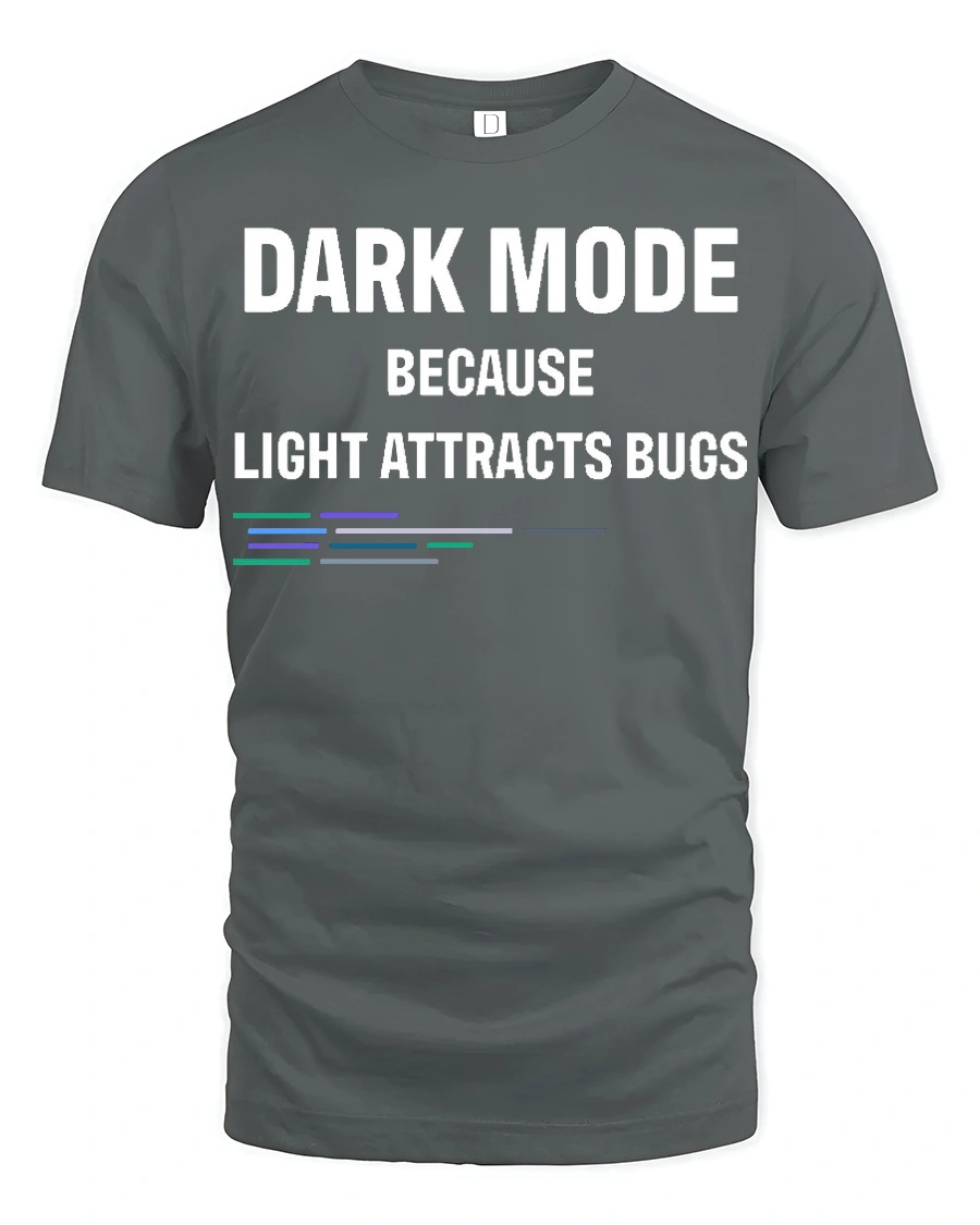 Dark Mode Because Light Attracts Bugs Funny Coding T Shirt Geek Tee is the perfect blend of humor and tech culture, designed to bring a smile to anyone who understands the struggles of coding.