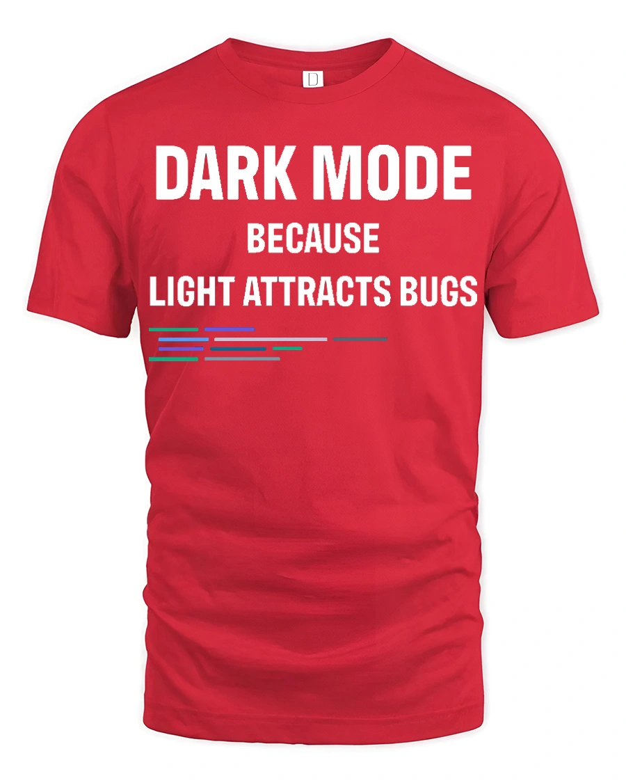 Dark Mode Because Light Attracts Bugs Funny Coding T Shirt Geek Tee - red t-shirt on white background