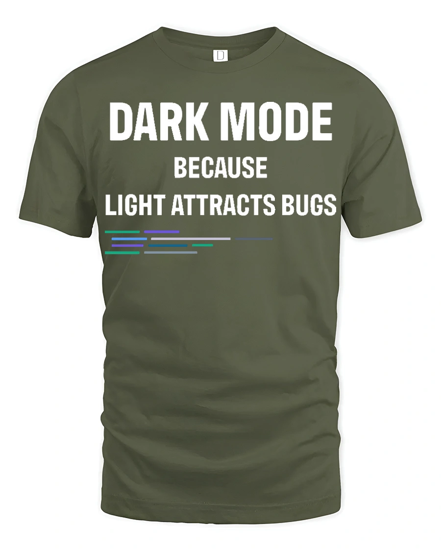 Dark Mode Because Light Attracts Bugs Funny Coding T Shirt Geek Tee - military green t-shirt on white background