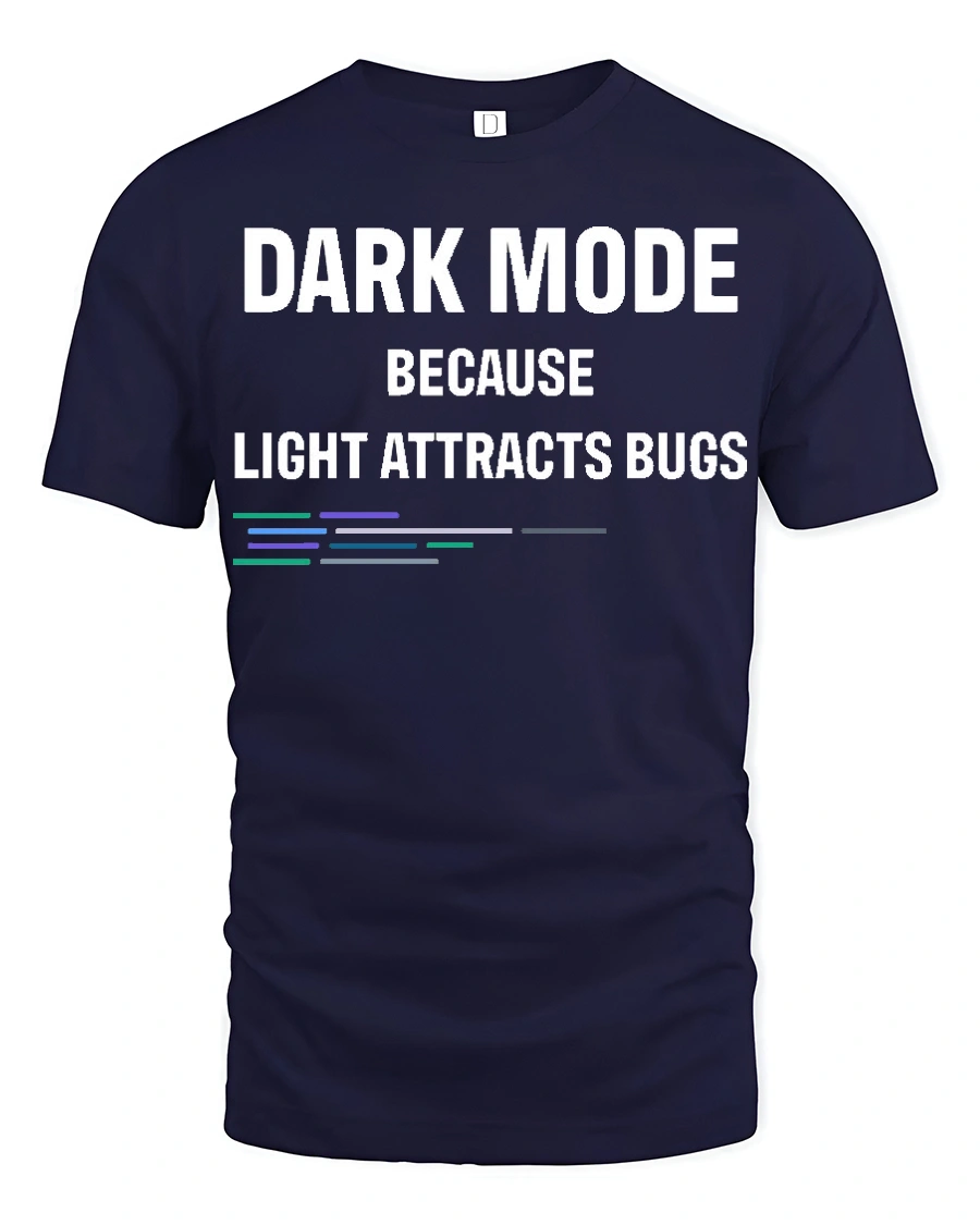 Dark Mode Because Light Attracts Bugs Funny Coding T Shirt Geek Tee - navy t-shirt on white background
