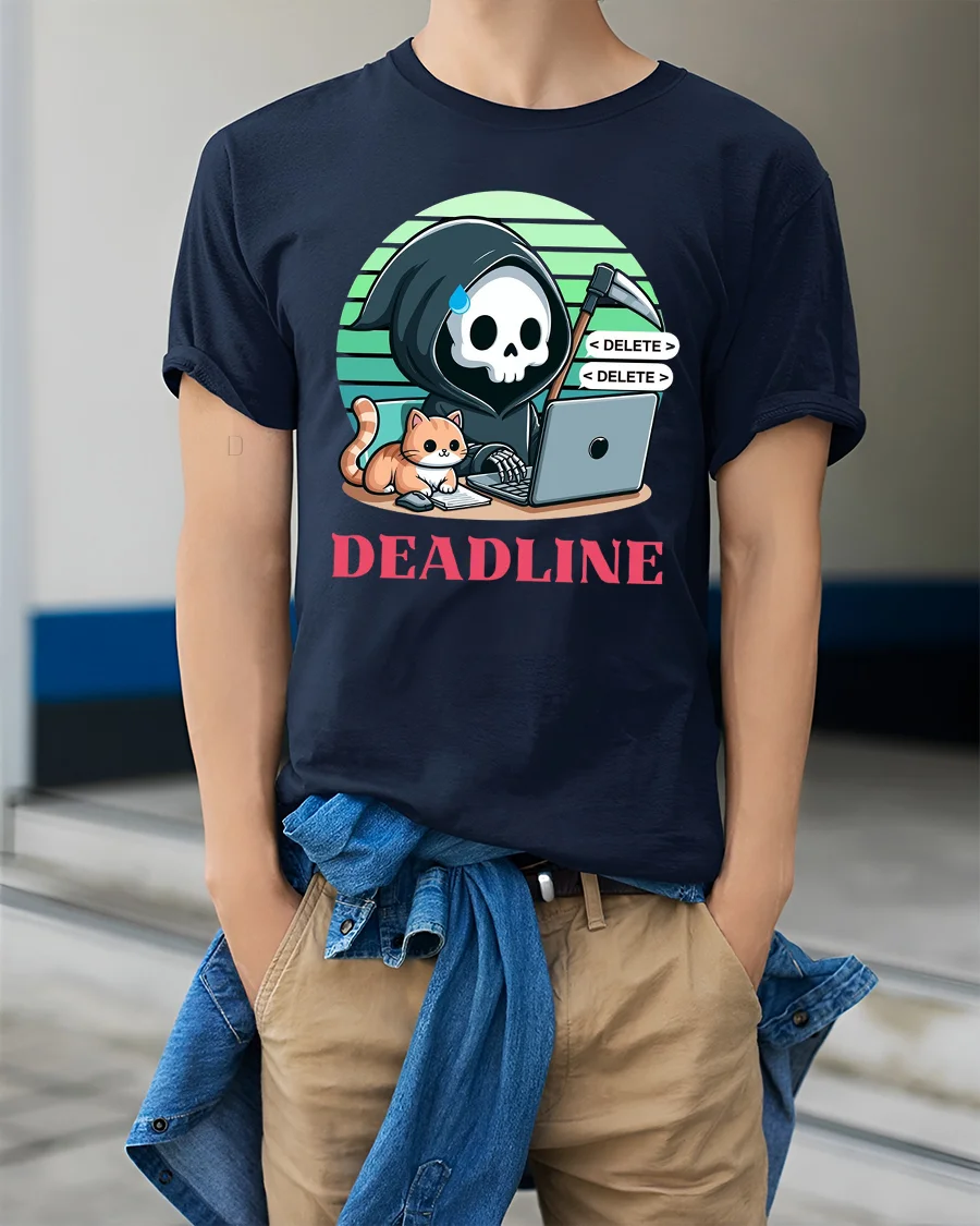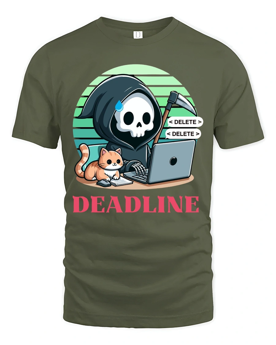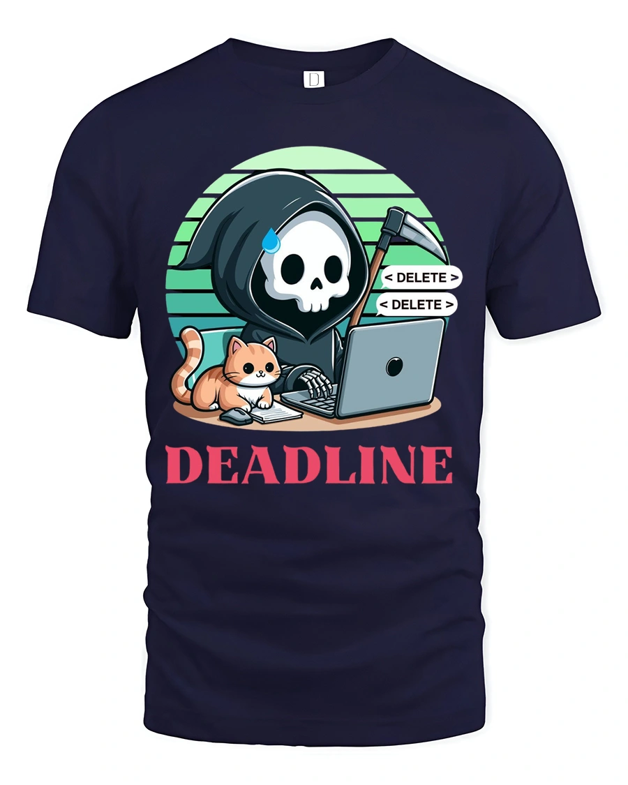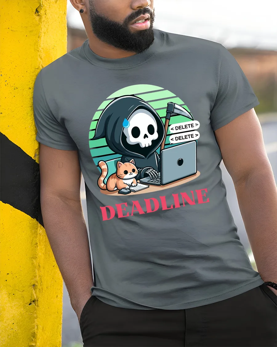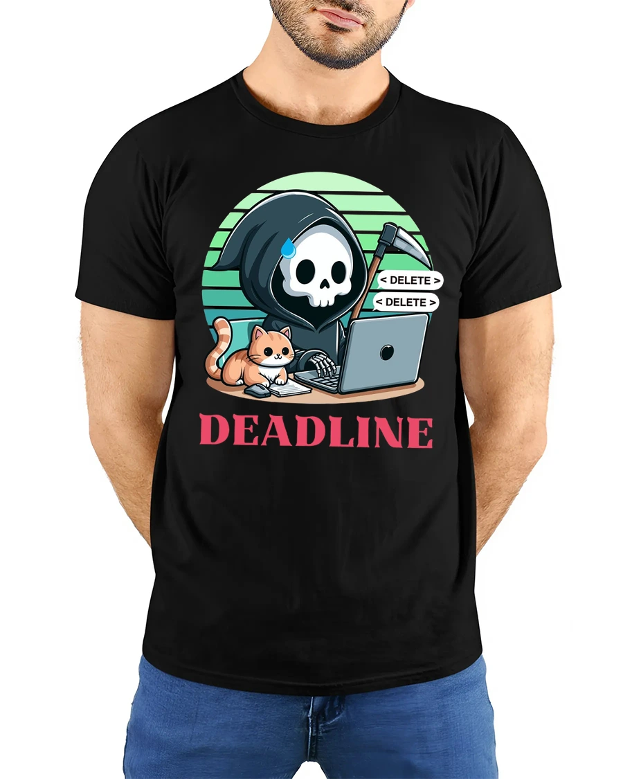 Deadline Grim Reaper Programmer Cat Funny Graphic T Shirt brings a clever mix of tech life and dark humor into one unique design.