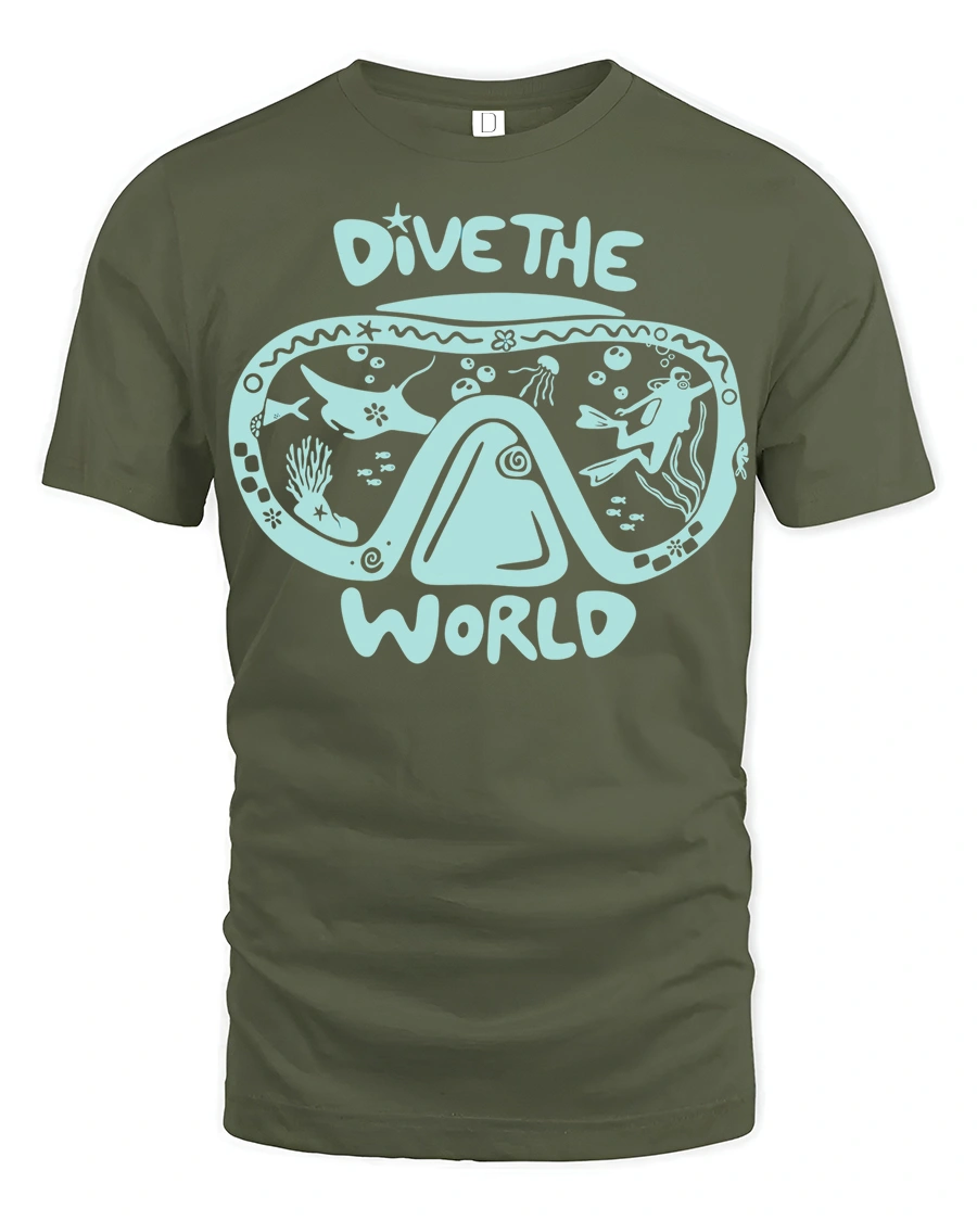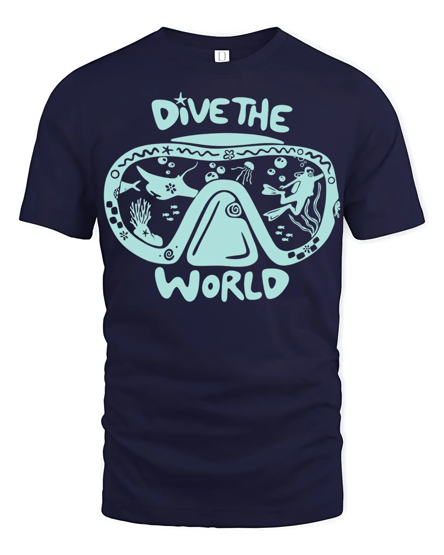 Explore the beauty of the ocean with the Dive The World Scuba Diving Graphic Tshirt Ocean Adventure Style that captures the excitement of underwater discovery and marine life exploration. The creative diving mask illustration filled with ocean creatures adds artistic depth and expresses passion for adventure curiosity and freedom. Soft comfortable fabric ensures an enjoyable wearing experience while the ocean inspired design enhances everyday casual style.