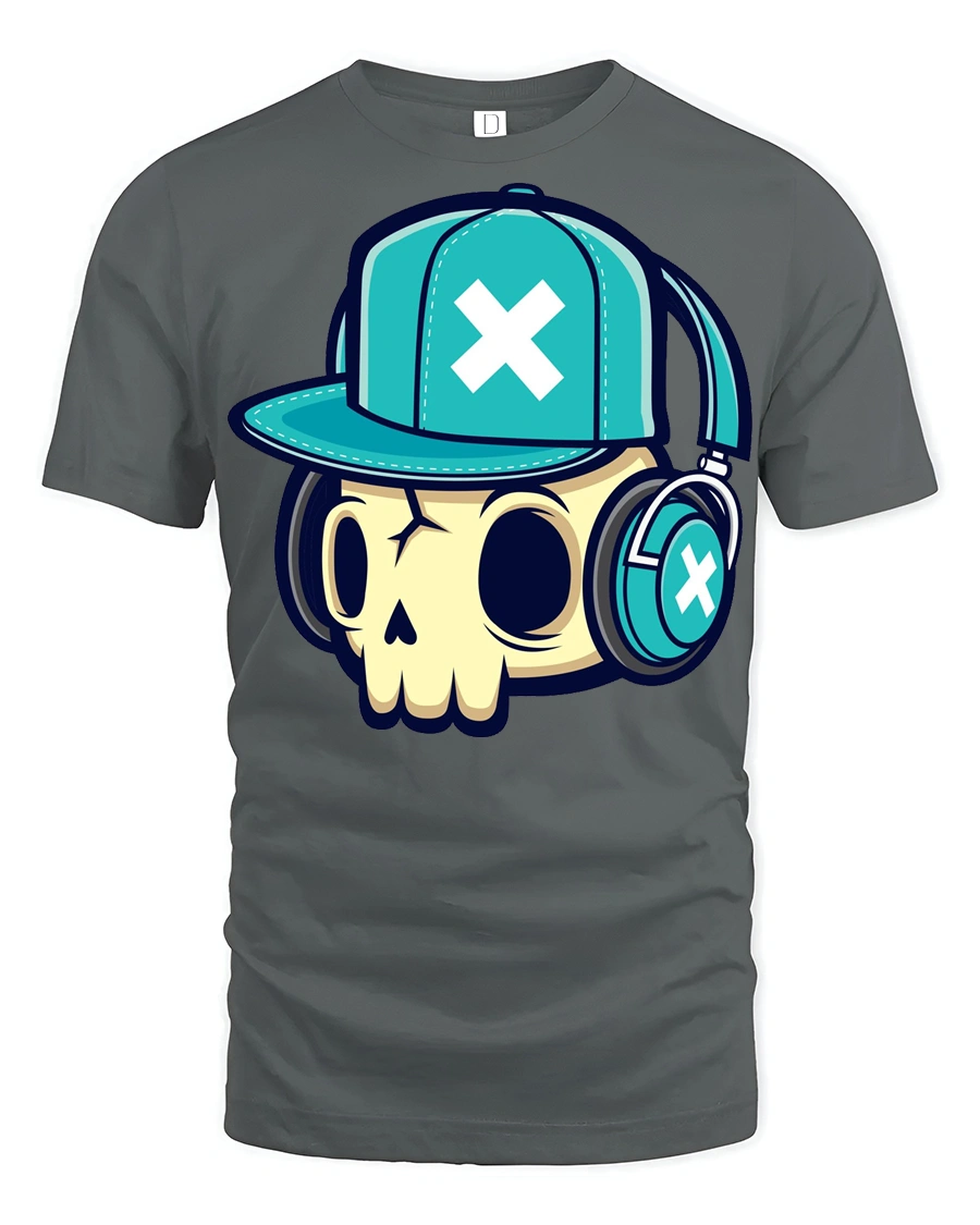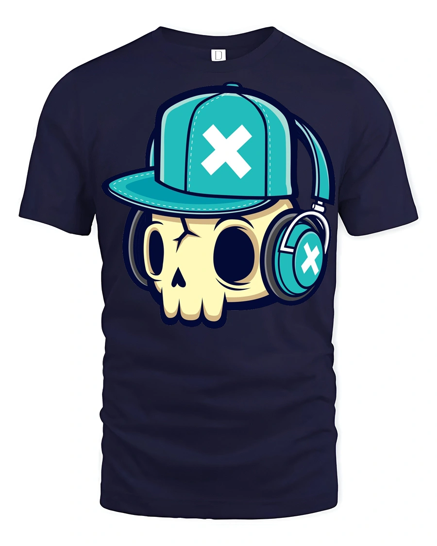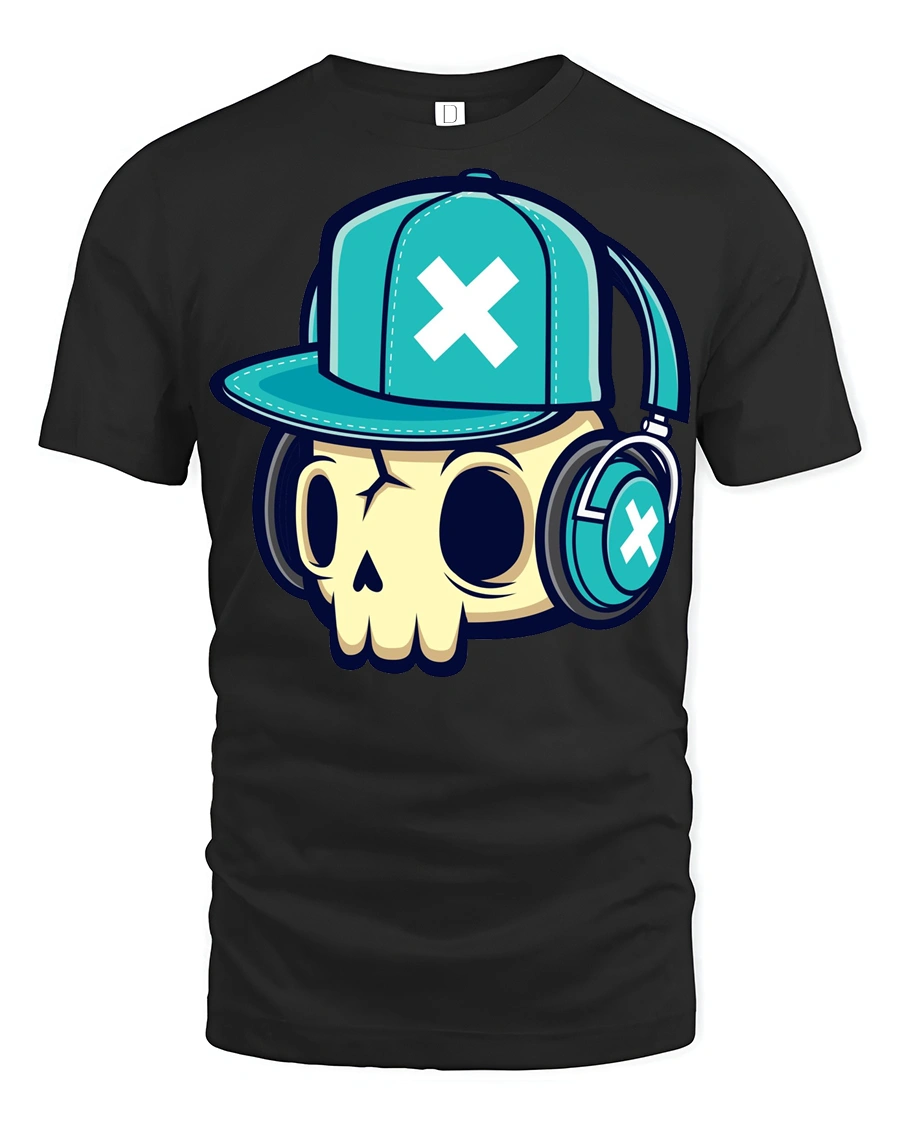 Featuring a cartoon skull wearing a cap and headphones, this design captures a cool DJ vibe with a playful and edgy twist.