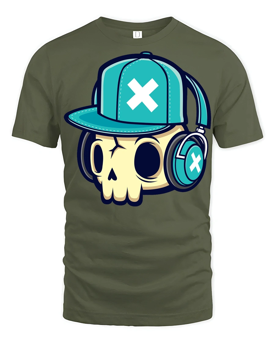 DJ Skull With Headphones Urban Style Graphic Tee Shirt - military green t-shirt on white background