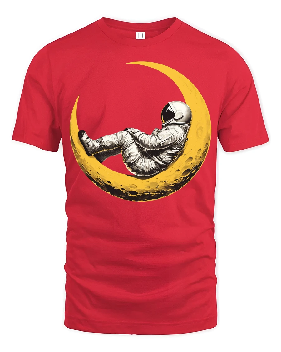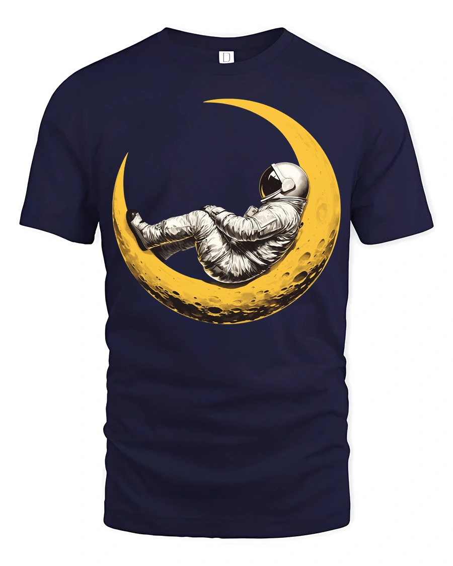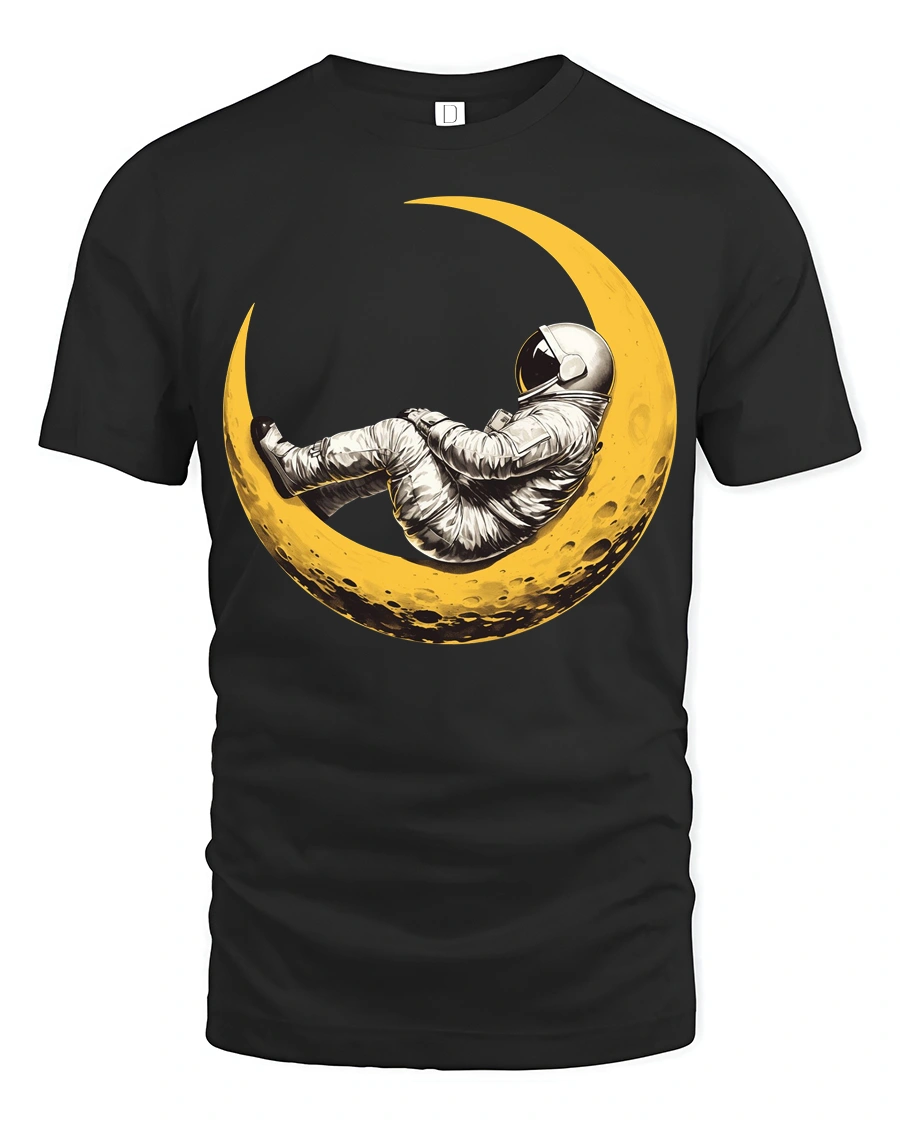 The design shows an astronaut relaxing on a glowing crescent moon, creating a dreamy scene that blends adventure, curiosity, and calm cosmic wonder.