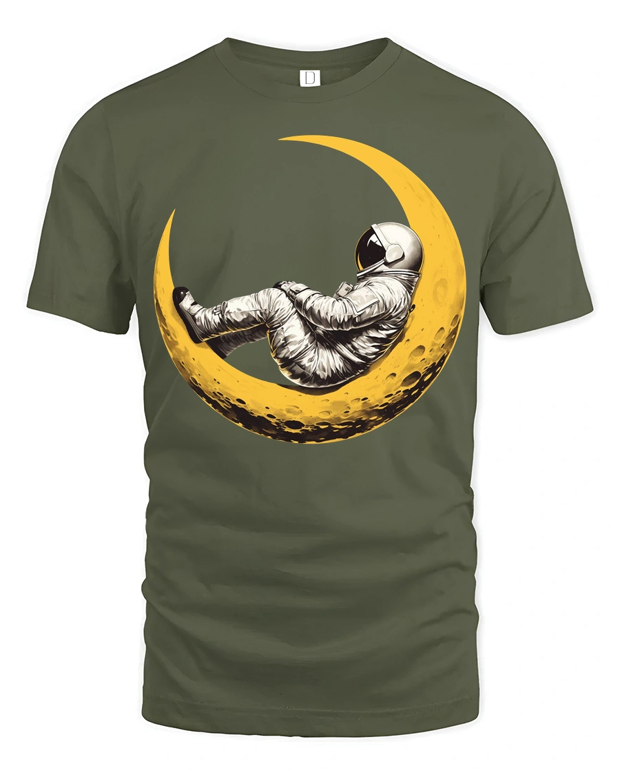Dreaming Astronaut Resting On Moon Space Art Graphic T Shirt - military green t-shirt on white background