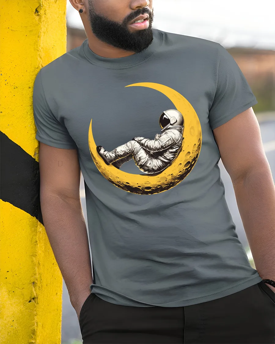 Dreaming Astronaut Resting On Moon Space Art Graphic T Shirt captures a peaceful and imaginative moment set in the vast beauty of space.