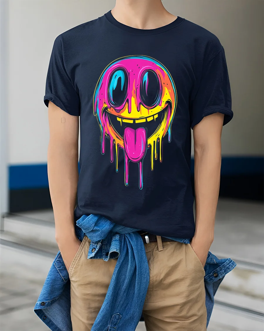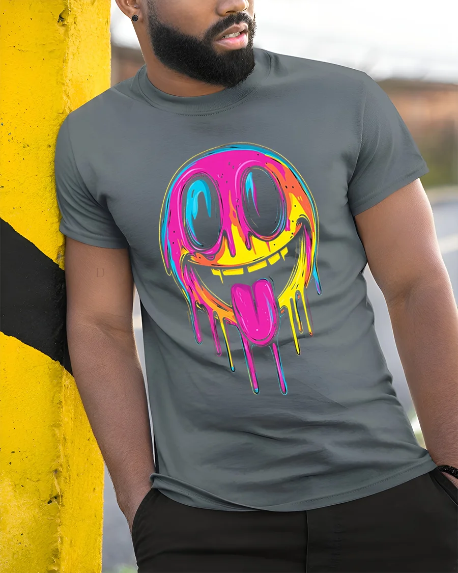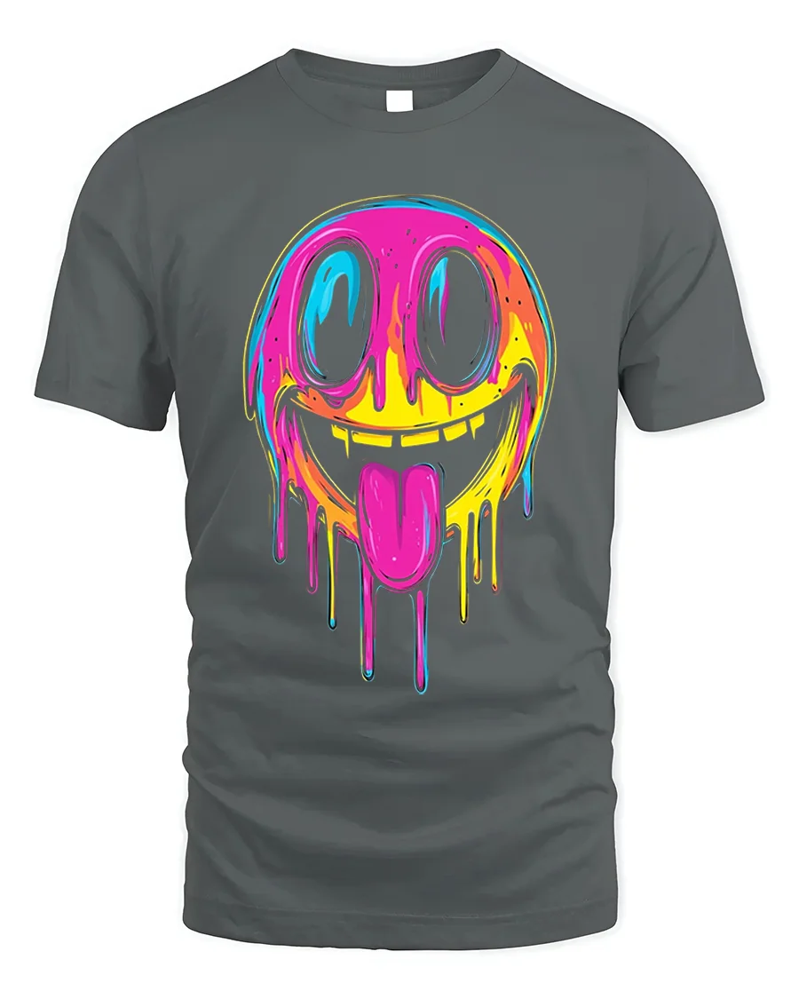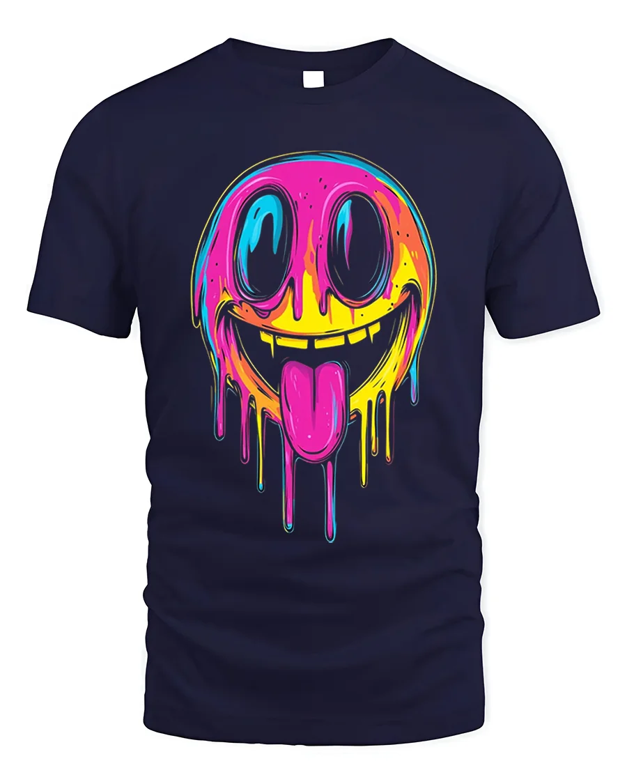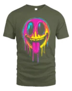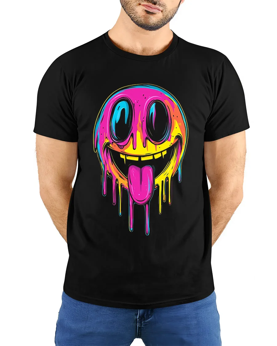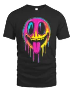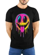 The Dripping Smile Face Neon Psychedelic Street Art T-Shirt pairs easily with jeans, joggers, or shorts for an effortlessly cool streetwear vibe.