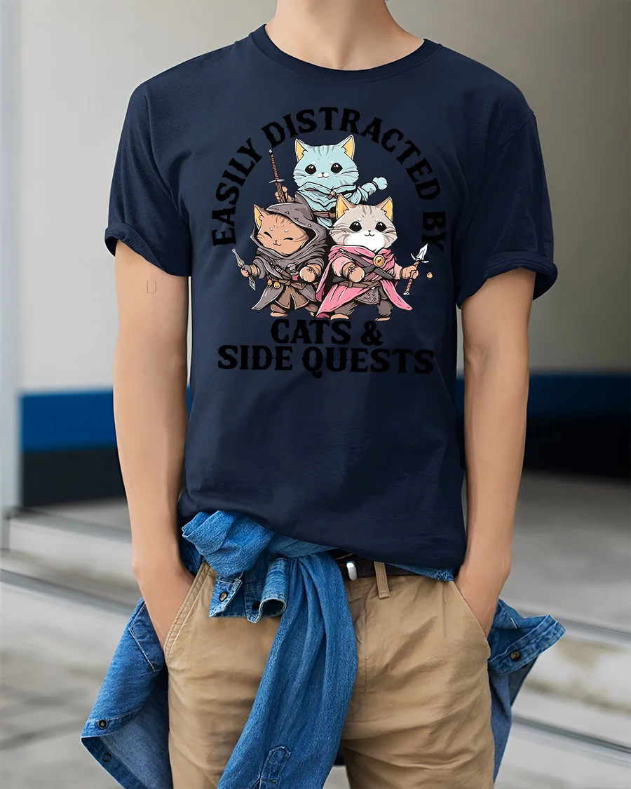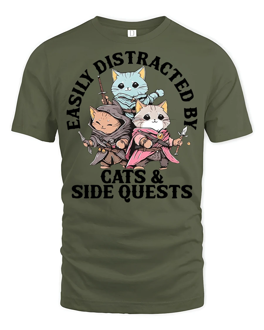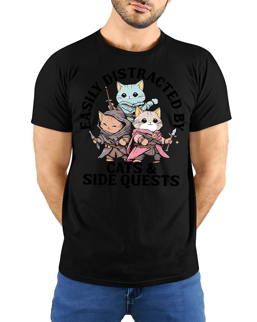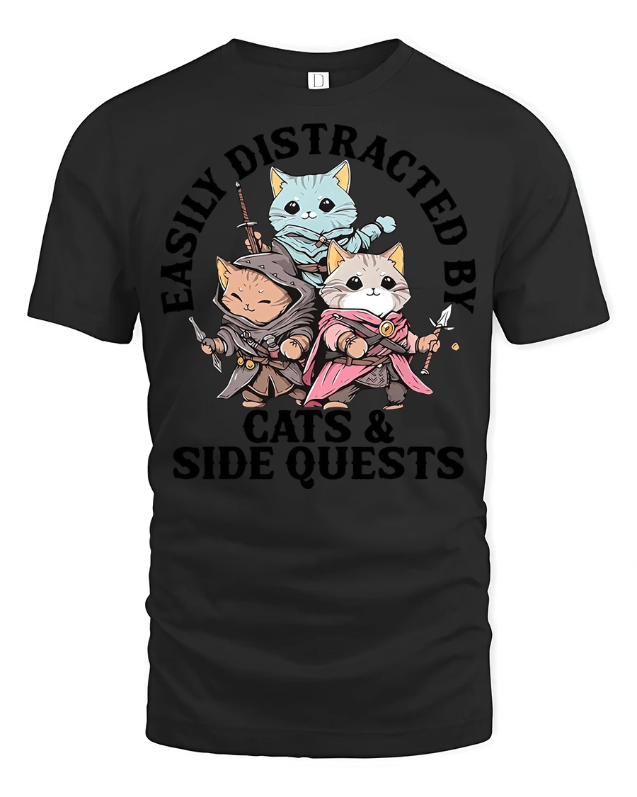 Easily Distracted By Cats And Side Quests Funny Gamer T Shirt blends humor and fantasy charm into one eye catching design.