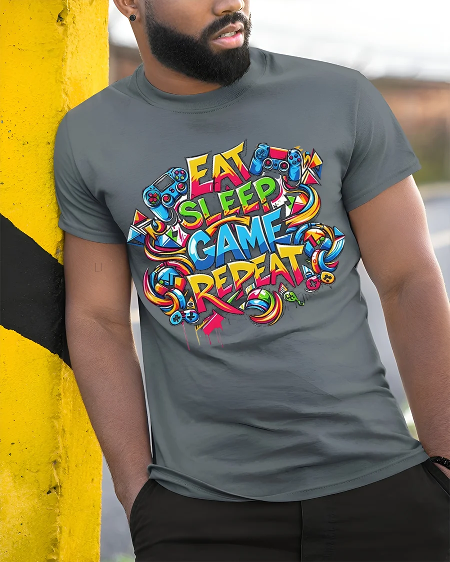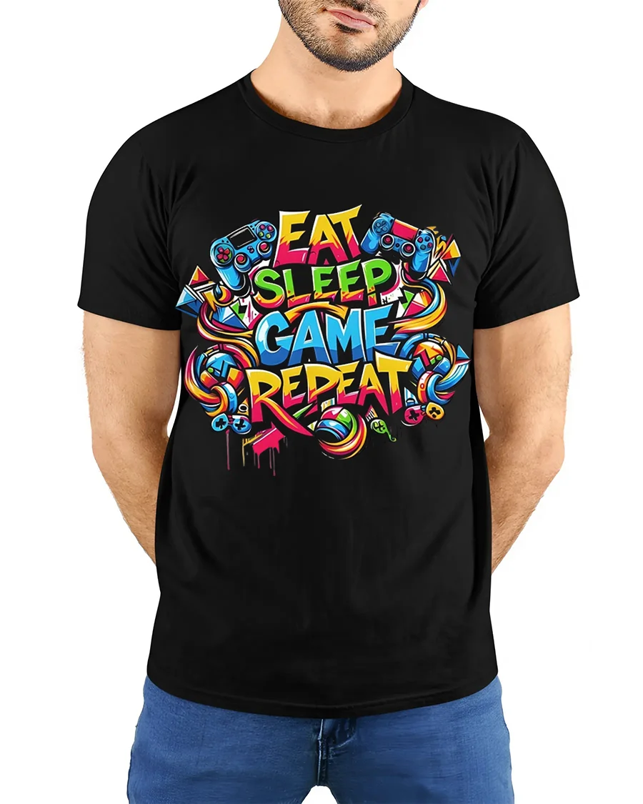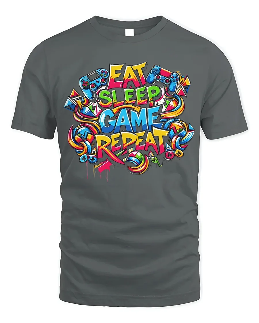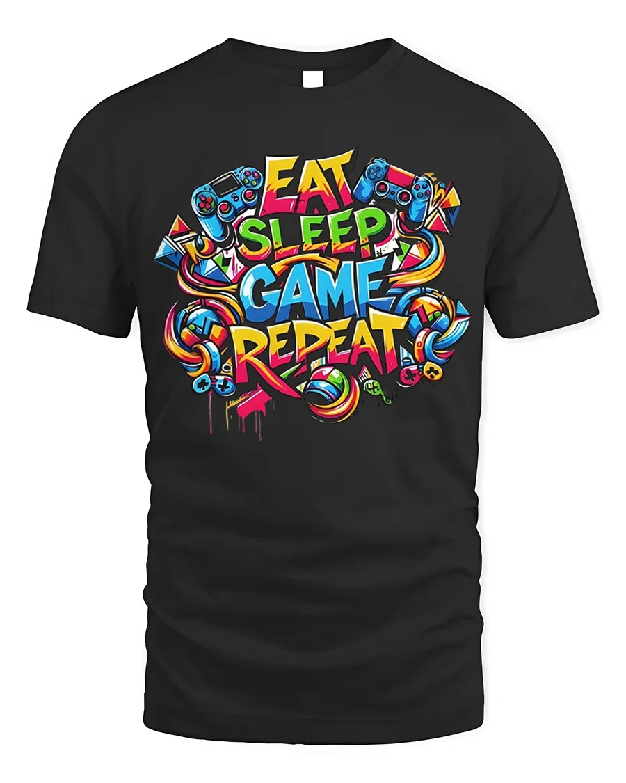 Home Trending Eat Sleep Game Repeat Neon Gamer Art Colorful Graphic T-Shirt