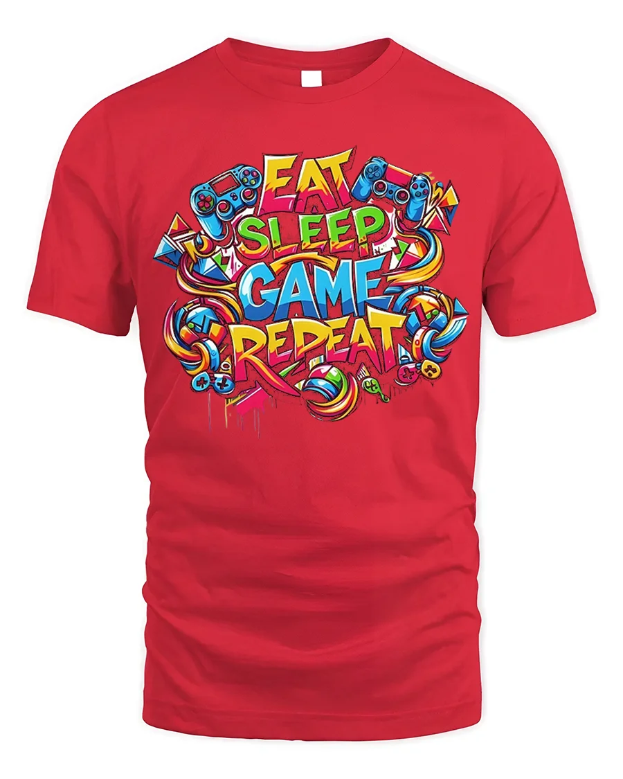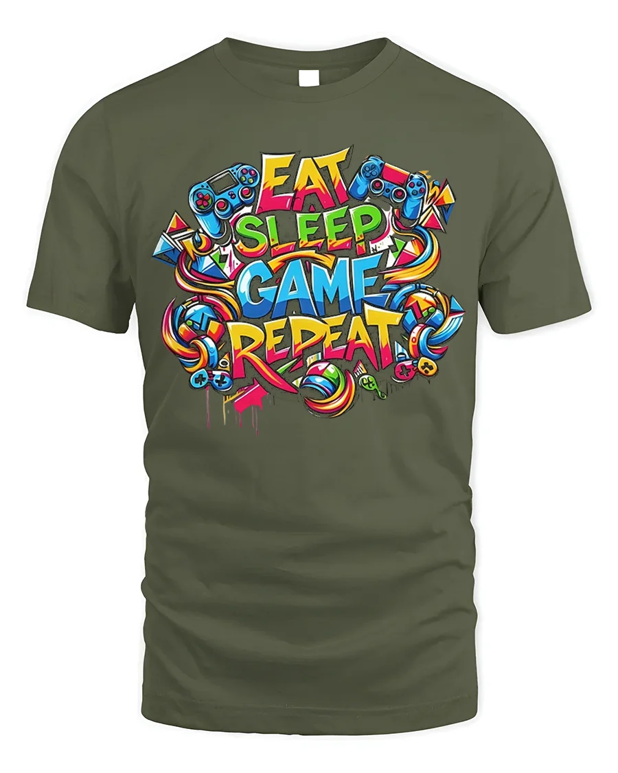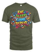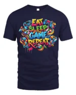 Eat Sleep Game Repeat Neon Gamer Art Colorful Graphic T-Shirt is the perfect choice for anyone who lives and breathes gaming culture. Featuring bold graffiti-style typography surrounded by controllers, arrows, and vibrant neon accents, this design captures the high-energy vibe of true gamers. The striking colors and dynamic layout make this tee stand out whether you’re competing, streaming, or chilling with friends.