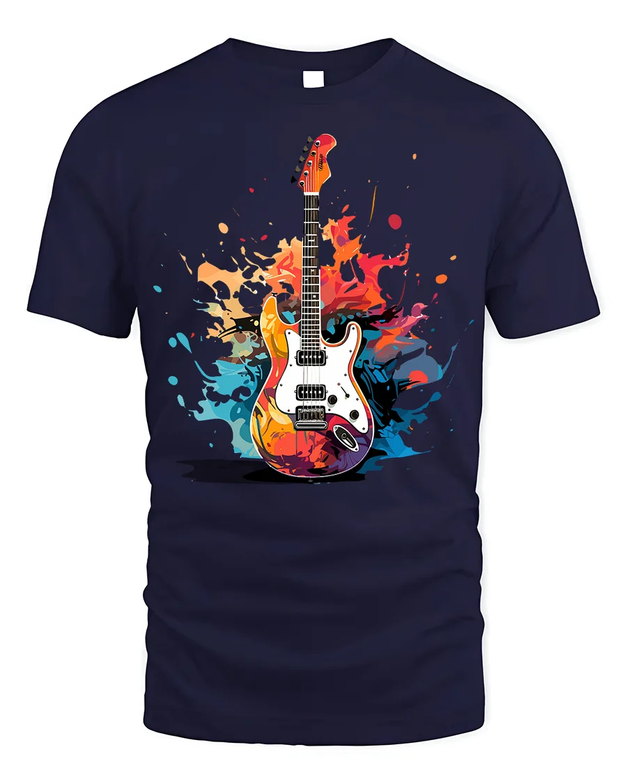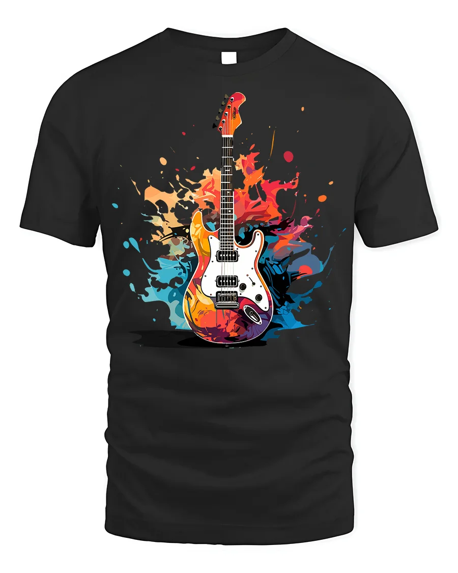 Turn up the volume on your style with the Electric Guitar Splash Art Graphic T-Shirt, a must-have for music lovers and creative spirits. This bold design features a striking electric guitar at the center, surrounded by a vibrant explosion of paint splashes in red, orange, blue, and black. Perfect for fans of rock, live music, or abstract art, this t-shirt hits all the right notes.